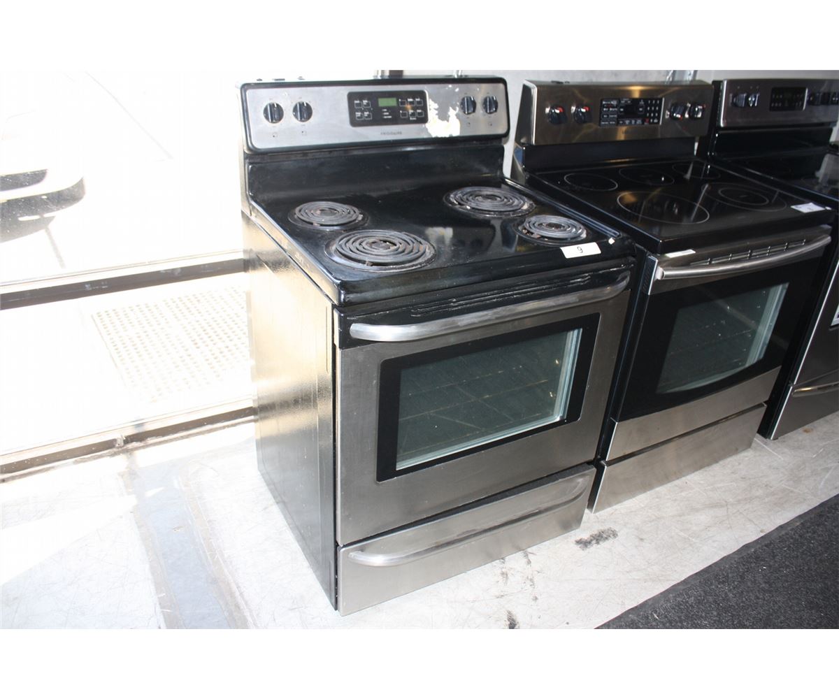 FRIGIDAIRE STAINLESS STEEL AND BLACK GLASS TOP 4 BURNER STOVE - MINOR PHYSICAL DAMAGE PRESENT