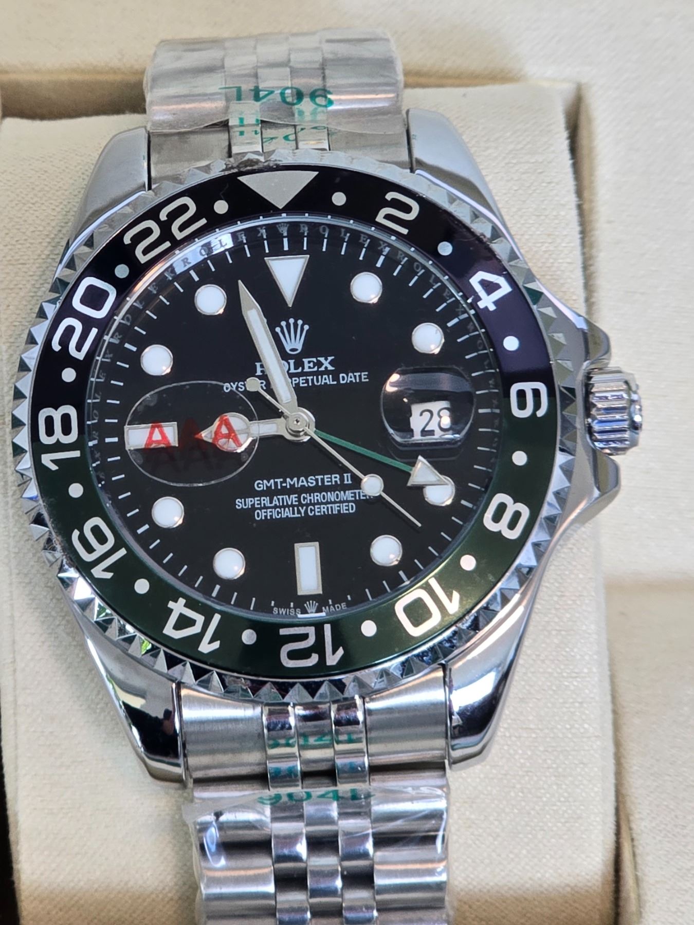FULLY AUTOMATIC ROLEX GMT MASTER II 40 MM REF# 126720VTNR - "SPRITE" - AAA QUALITY REPLICA WATCH WITH DAY, BLACK DIAL WITH WHITE INDEXES, 904L STAINLESS STEEL CASE (THE SAME STEEL USED IN AUTHENTIC ROLEX WATCHES), & GREEN/BLACK SPINNING BEZEL, STAINLESS STEEL OYSTER BRACELET, FULL SET WITH BOX, PAPERS AND BAG, CROWN IS ON THE RIGHT SIDE, BUT IT’S STILL THE “SPRITE†ROLEX, BUT DESIGNED FOR THE RIGHT- HANDED PEOPLE