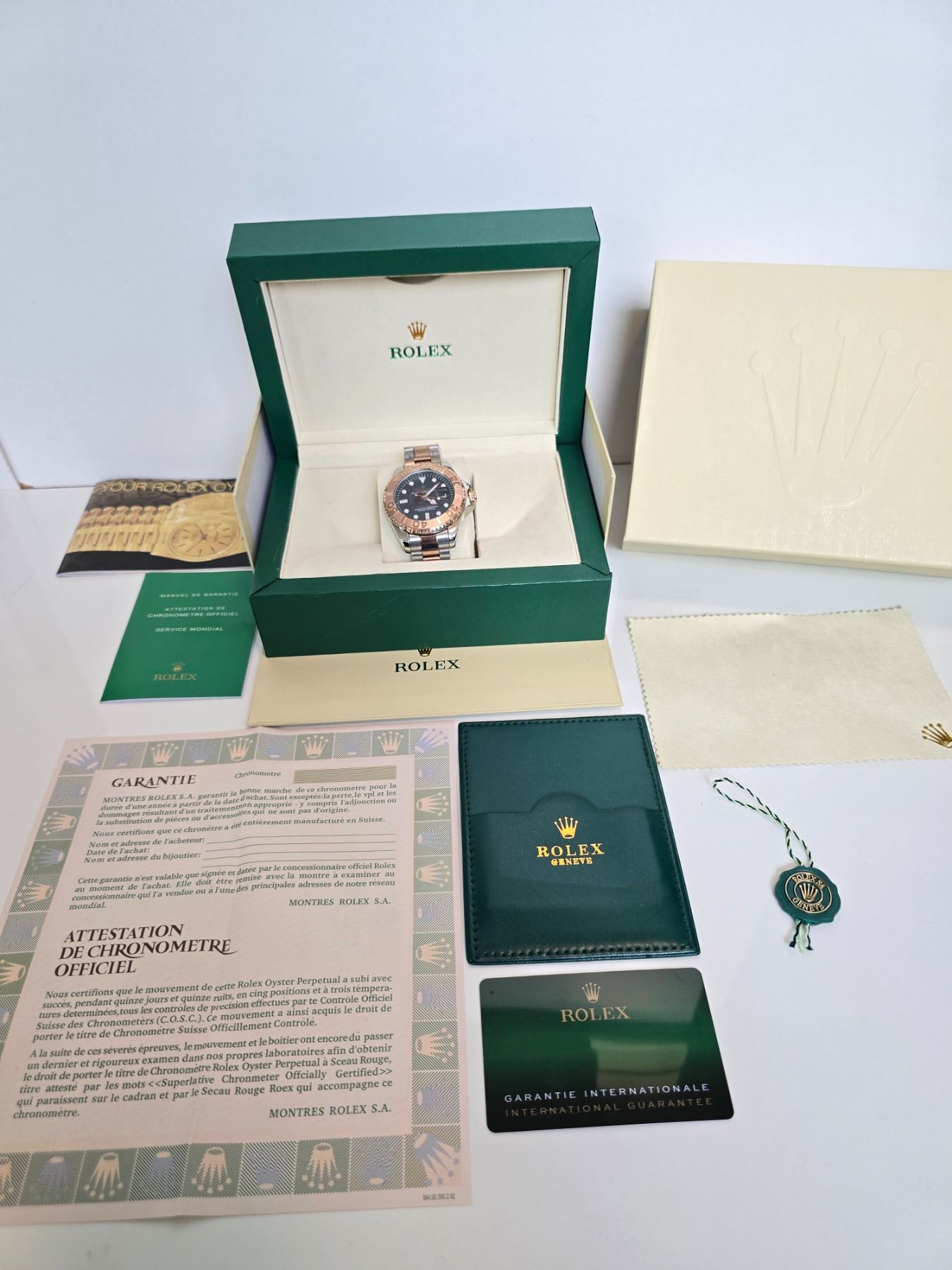 FULLY AUTOMATIC ROLEX YACHTMASTER 40 MM ROSE GOLD HIGH QUALITY REPLICA WATCH, REF# 16623 BLACK DIAL WITH WHITE INDEXES, ROSE GOLD SPINNING BEZEL WITH MARKERS AND ROSE GOLD CROWN, 904L STAINLESS STEEL CASE (THE SAME STEEL USED IN AUTHENTIC ROLEX WATCHES) 2 TONE GOLDEN OYSTERSTEEL BRACELET. FULL SET WITH BOX PAPERS & BAG