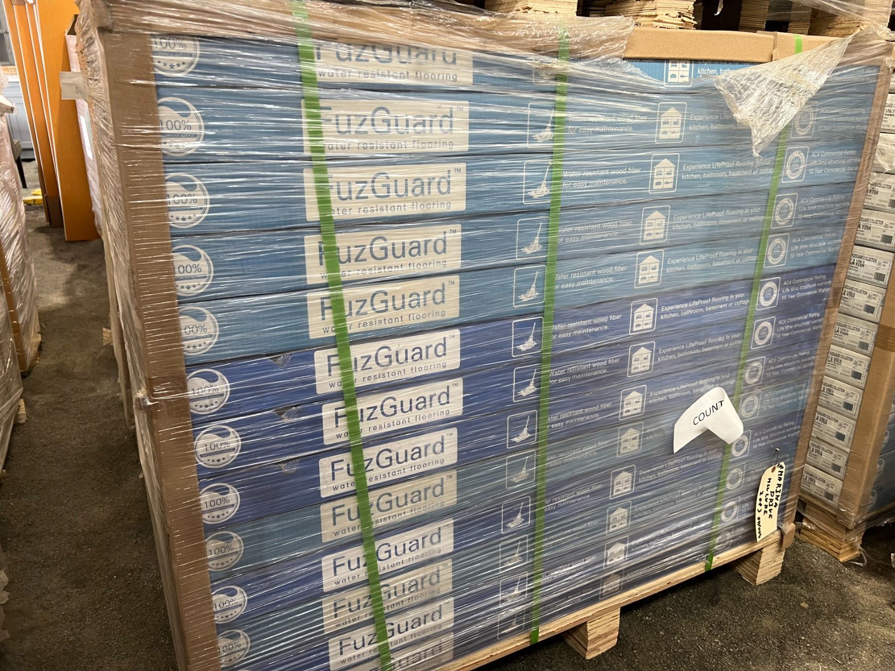 FUZGUARD COLLECTION - "LA VINA" HIGH QUALITY LAMINATE FLOORING - CLICK TOGETHER 100% WATER PROOF SURFACE - 6-1/2" X 1/2" X 48" - 12.98 SQ FT PER BOX, 65 BOXES TOTAL COVERAGE 843.7 SQ FT - TOTAL PALLET WEIGHT 2065LBS