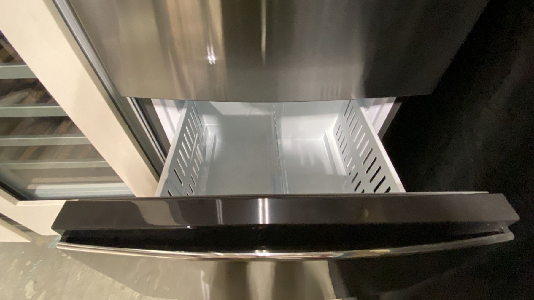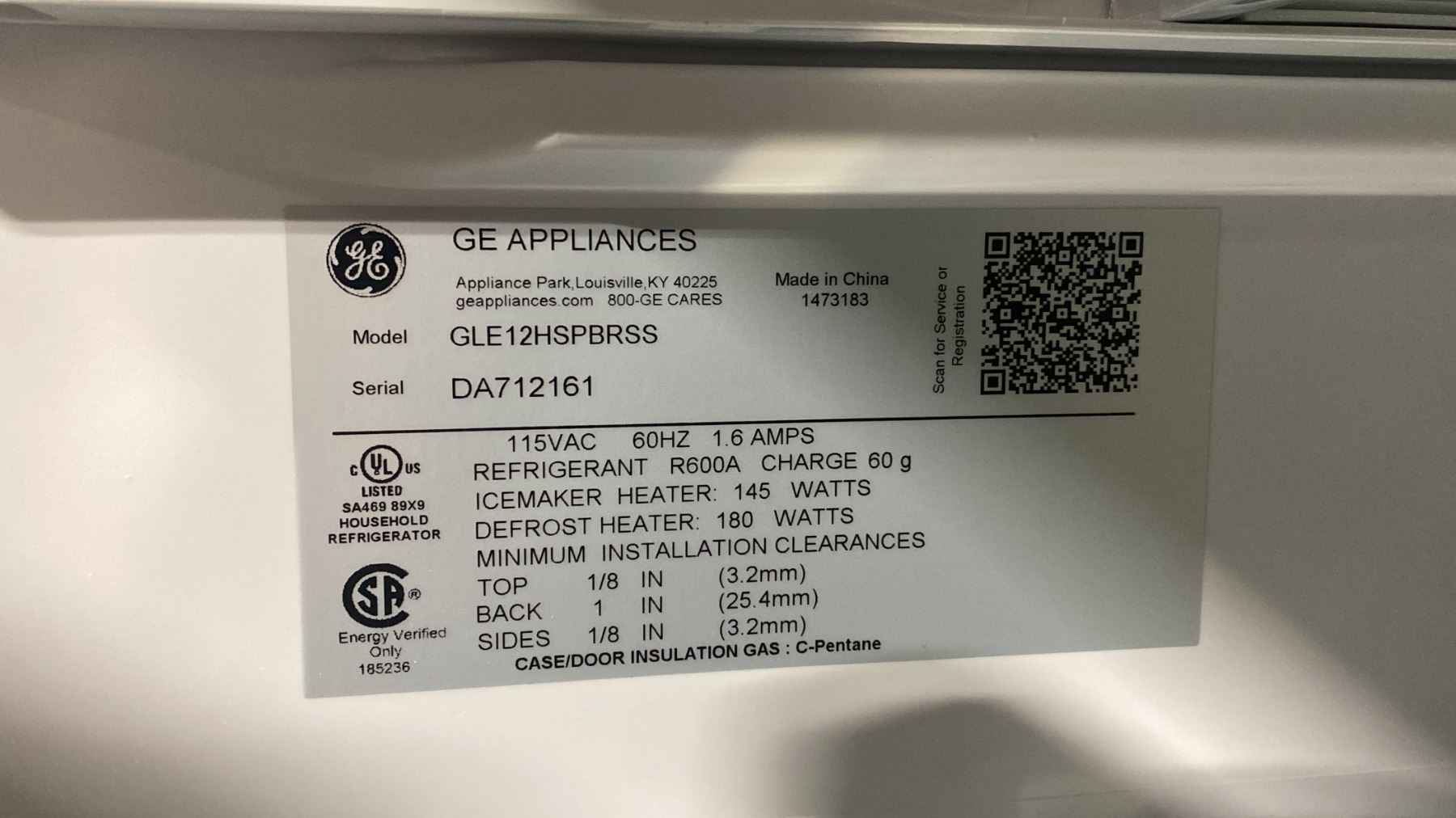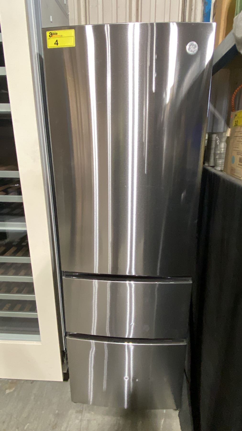 G.E APPLIANCES MODEL GLE12HSPBRSS. STAINLESS STEEL SINGLE DOOR 2 DRAWER BOTTOM FREEZER REFRIGERATOR SN DA712161 RETAIL PRICE $1,999.00