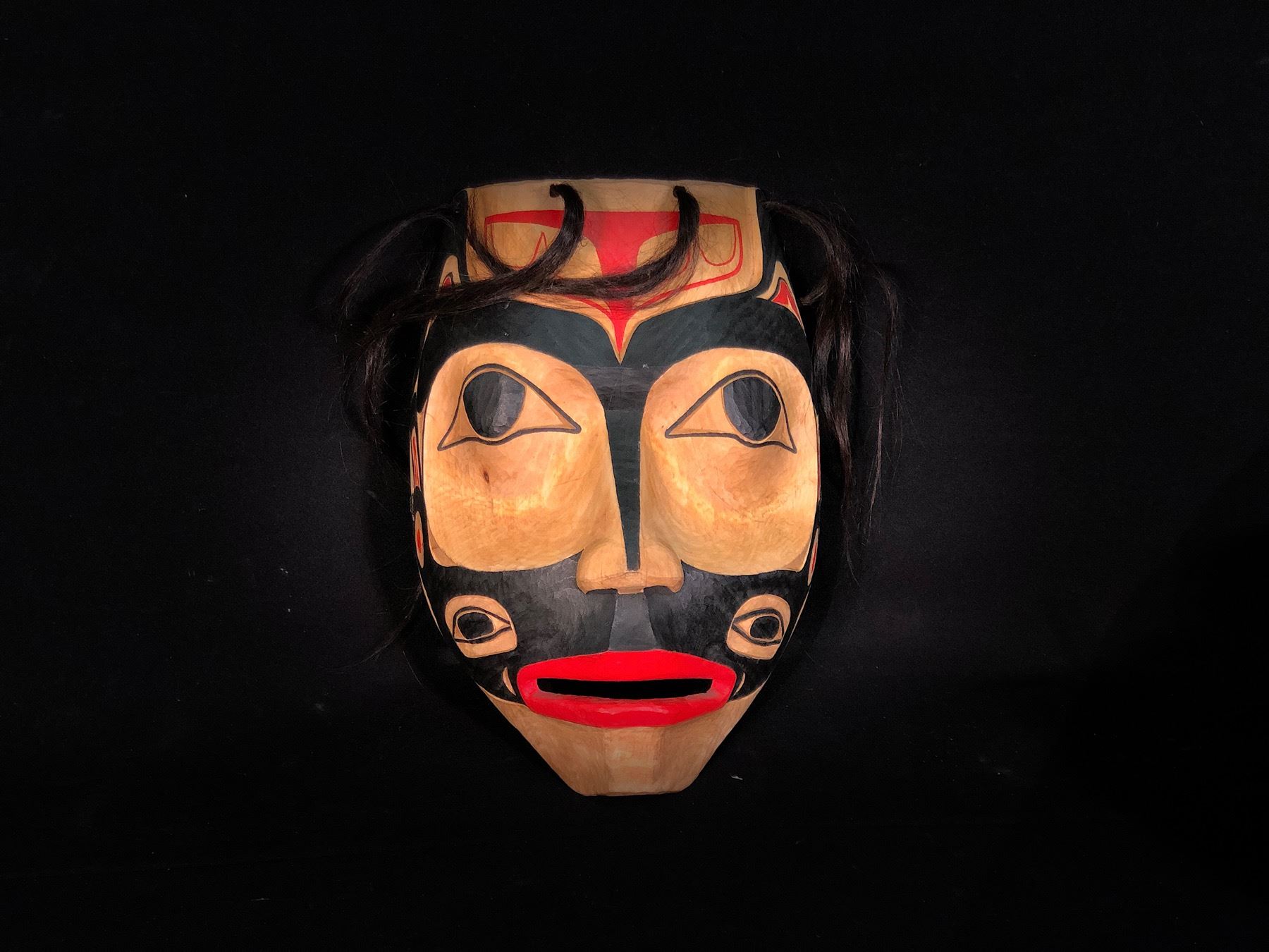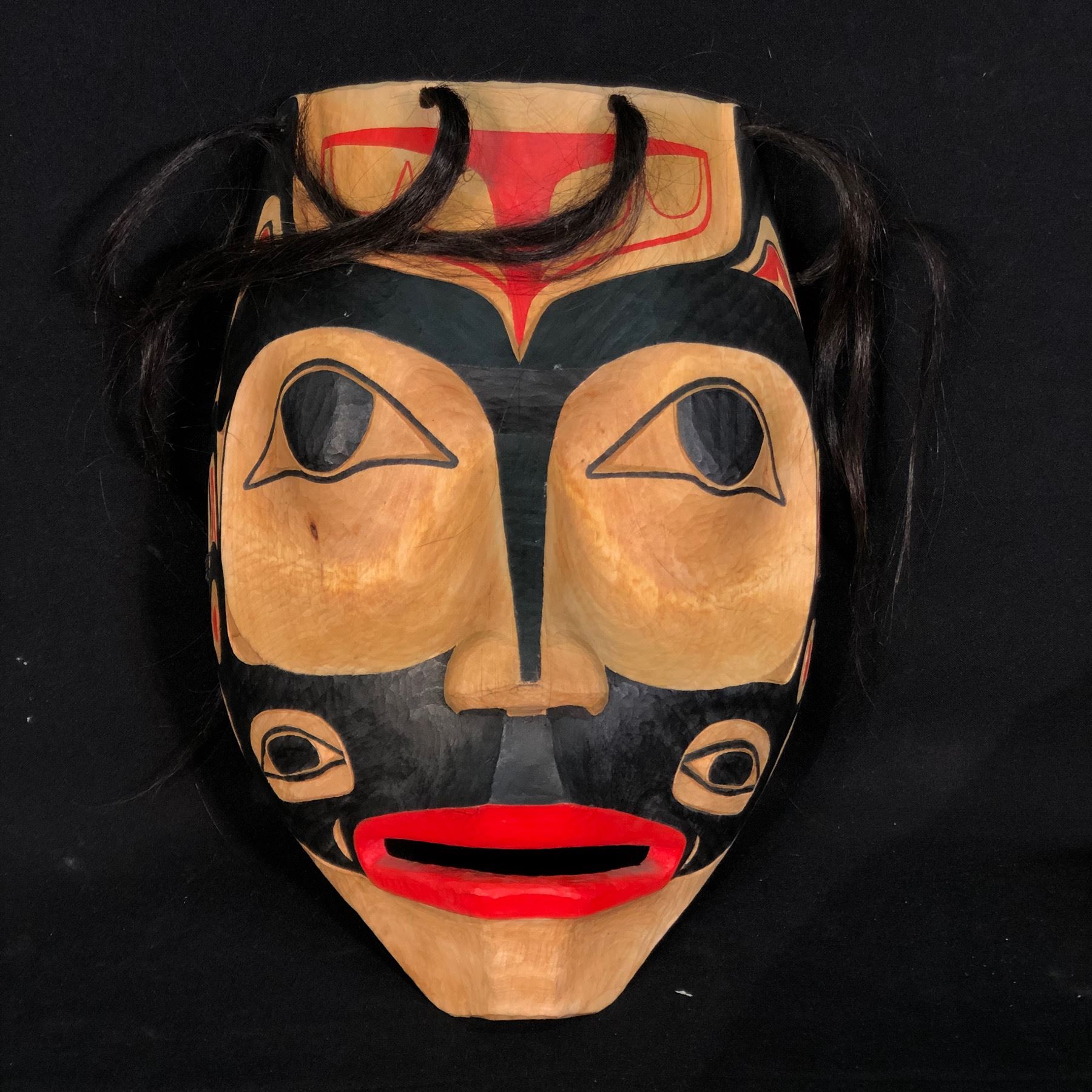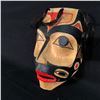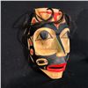 G. WILSON HAND CARVED AND PAINTED "KILLER WHALE PORTRAIT" MASK WITH HORSE HAIR ACCENTS, 13'' T X 9'' W, SIGNED ON BACK BY ARTIST