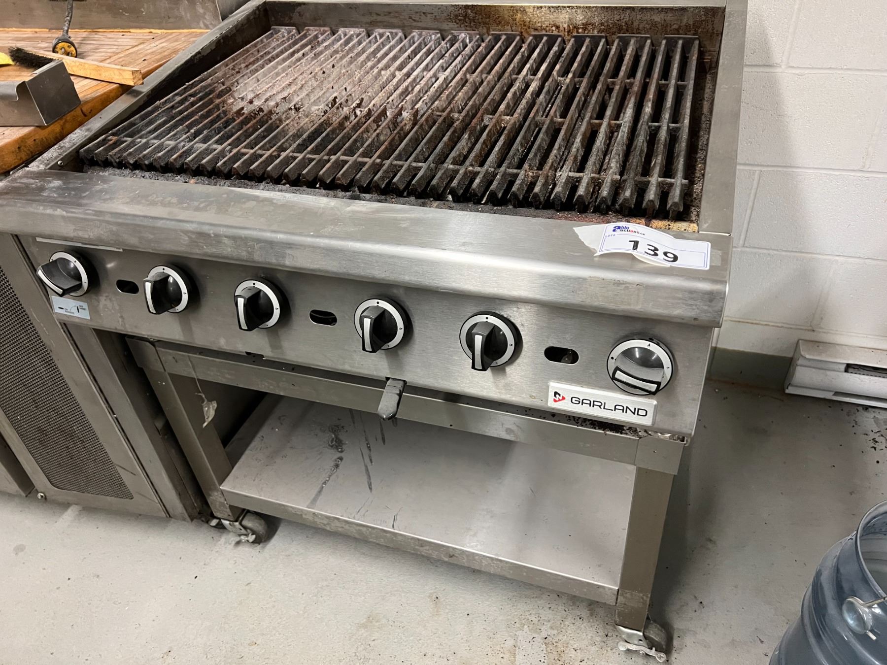 GARLAND 36" WIDE GAS GRILL ON WHEELED BASE. 6 BURNERS