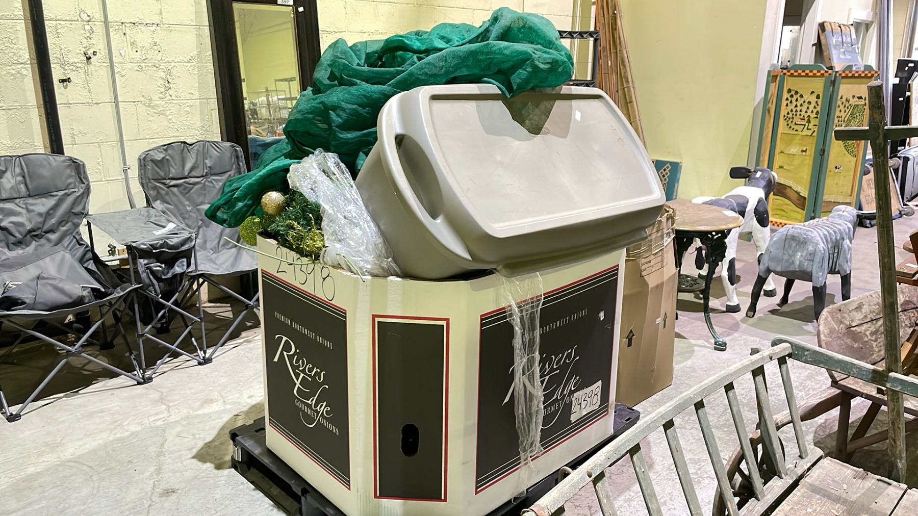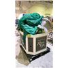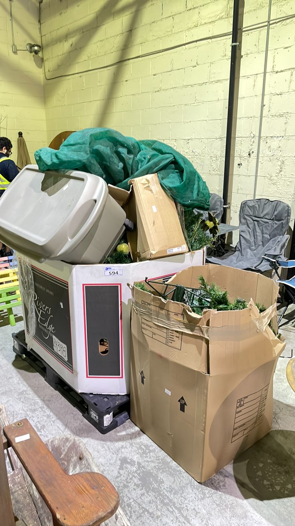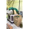 GAYLORD & BOX OF ASSORTED CHRISTMAS DECOR & TREE