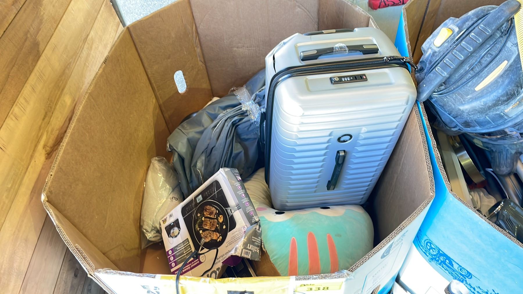 GAYLORD OF ASSORTED ITEMS INCLUDING; HARD SHELL LUGGAGE, SEALY INFLATABLE MATTRESS, SALTON INDUCTION COOKTOP & MORE (UNKNOWN WORKING CONDITION, MAY BE MISSING PARTS & PIECES)