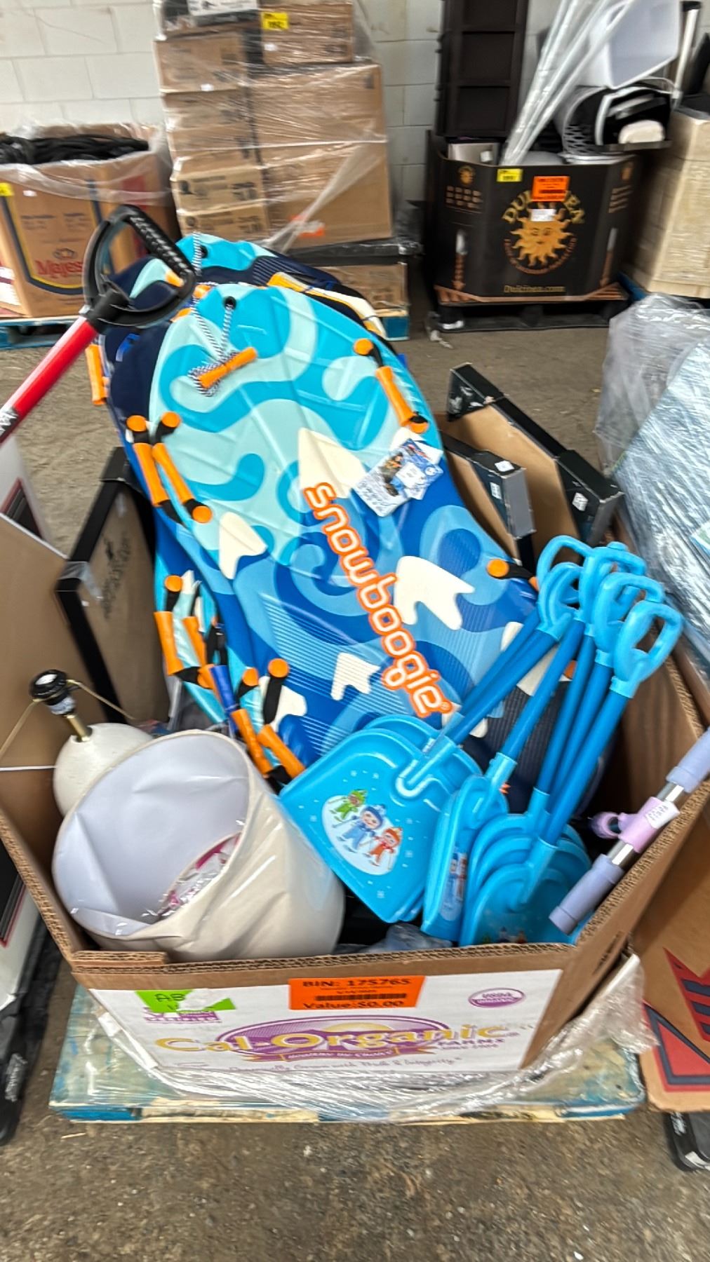 GAYLORD OF ASSORTED ITEMS INCLUDING; SNOW SLEDS, WALL DECOR, KIDS SHOVELS & MORE