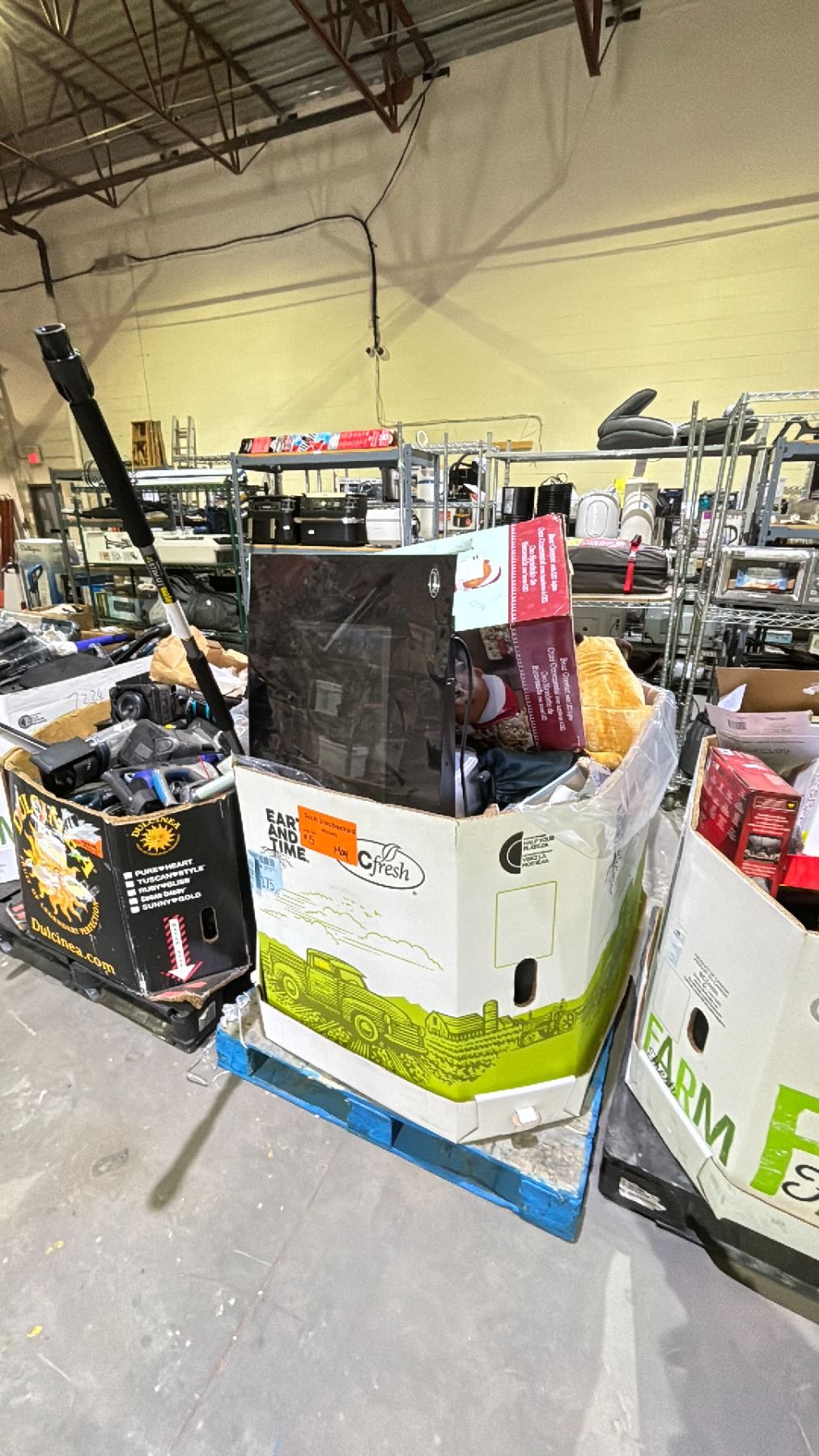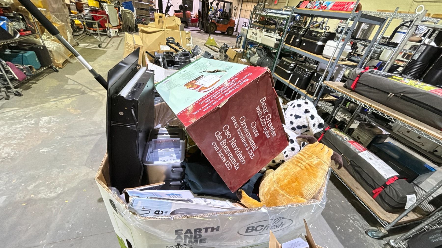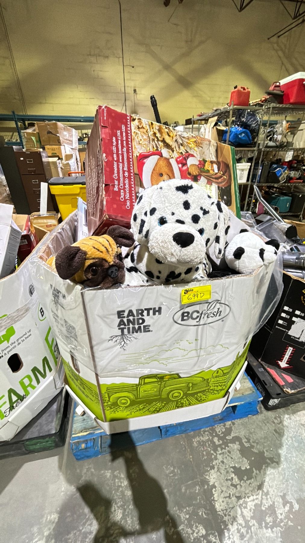 GAYLORD OF ASSORTED STUFFED ANIMALS, CHRISTMAS BEAR GREETER WITH LED LIGHTS, SEVILLE TOWER FAN AND MORE