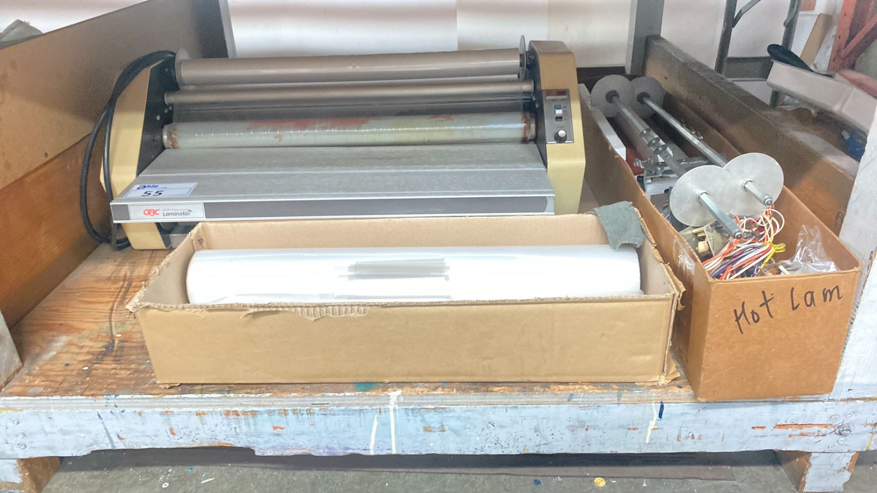 GBC ELECTRIC TABLETOP HOT LAMINATOR WITH BOX OF LAMINATE AND A BOX OF PARTS ** NEEDS REPAIR **