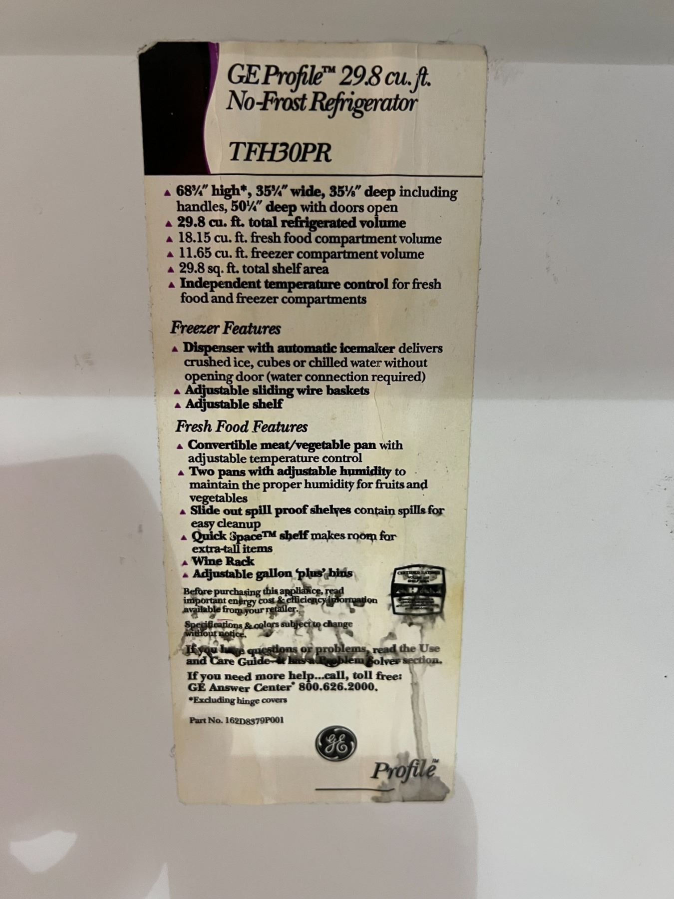 GE PROFILE FRENCH DOOR FRIDGE 29.8 CU FT (WATER NOT CONNECTED UNABLE TO TEST ICE MAKER)