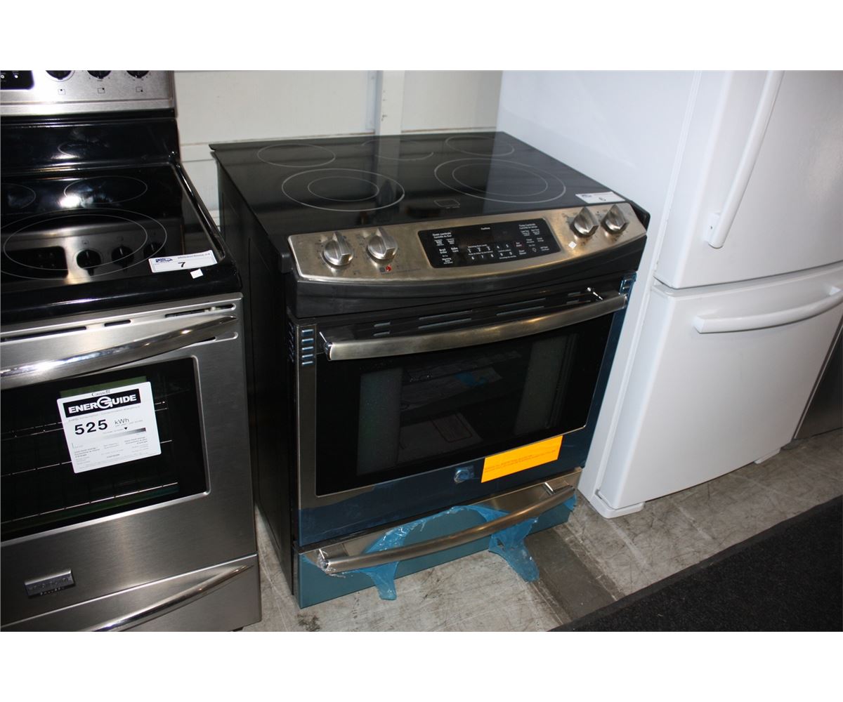 GE STAINLESS STEEL AND BLACK GLASSTOP 5 BURNER STOVE - GLASS TOP HAS CRACK PRESENT