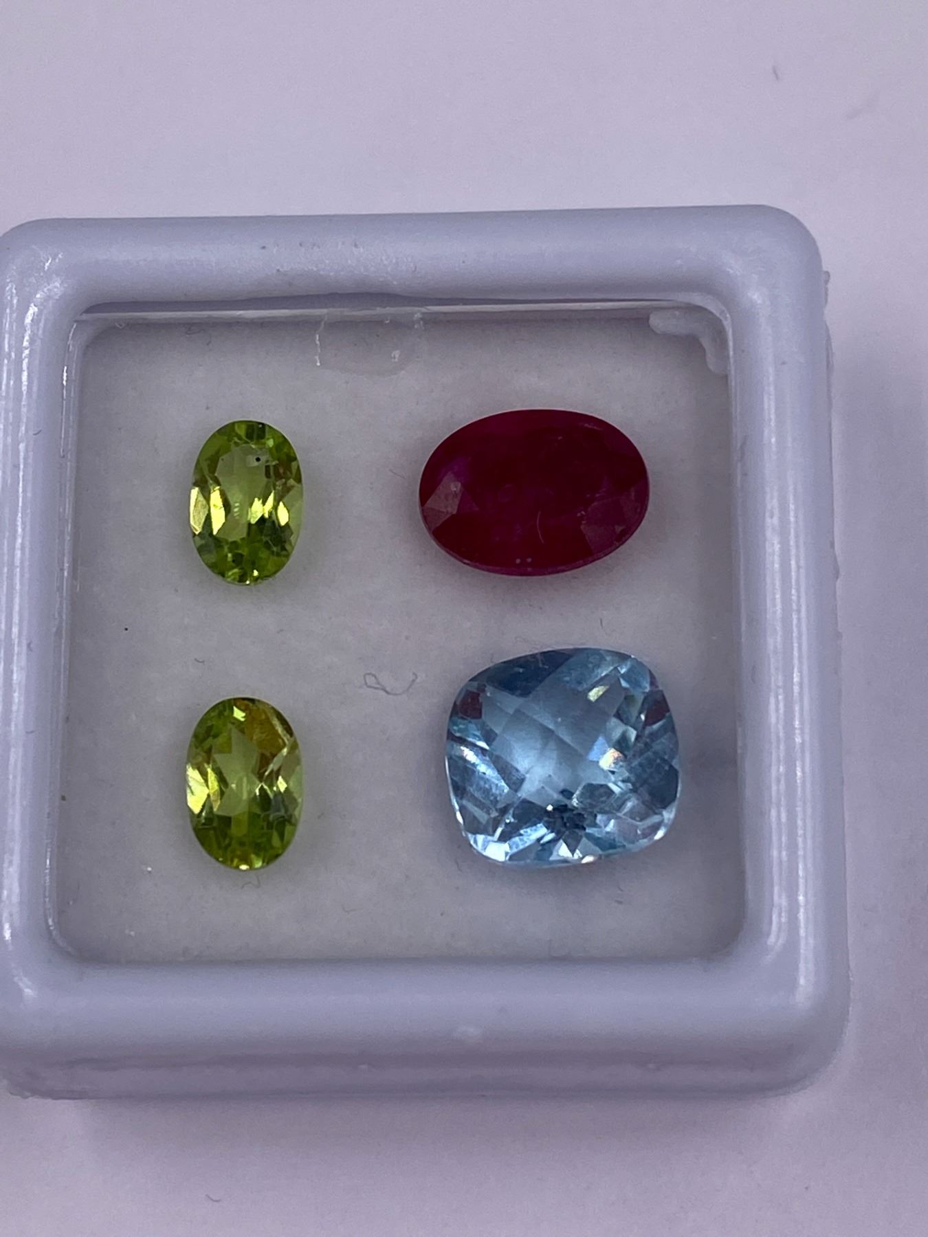 GEMSTONE MIX; RUBY 1.85CT, OVAL, VS, POSSIBLE GF, TOPAZ 2.55CT, SQUARE, VVS, BRAZIL, PERIDOT