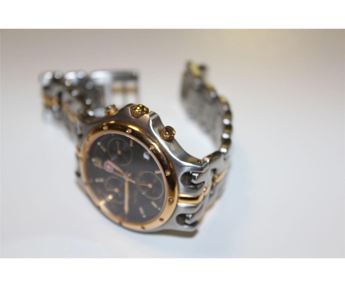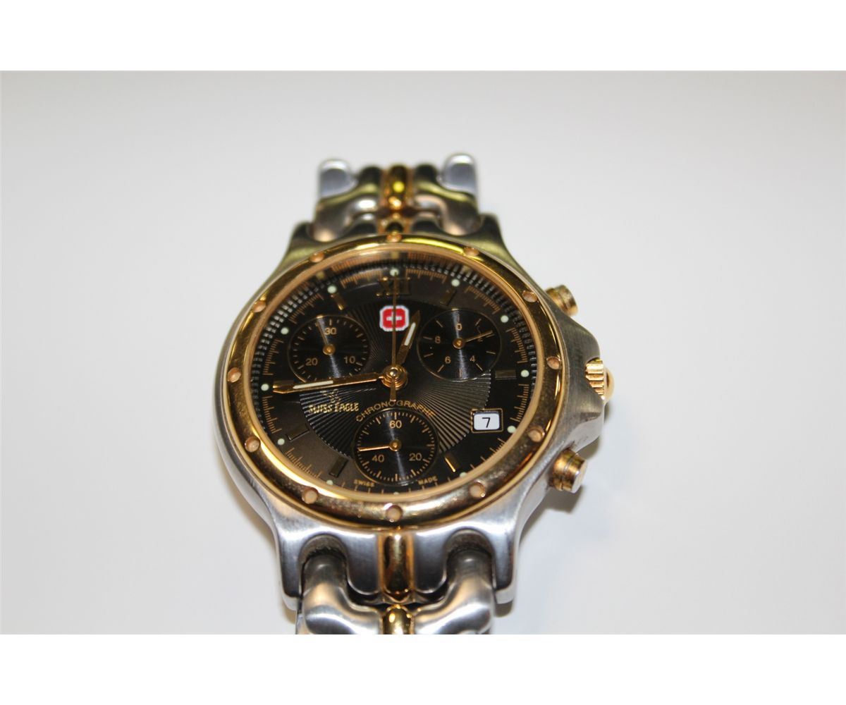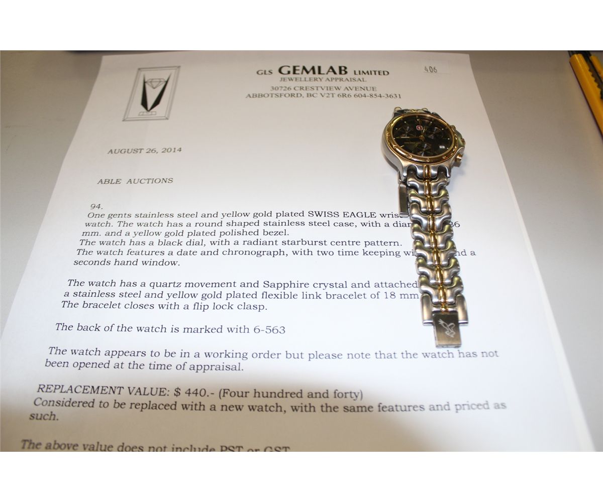 GENTS STAINLESS STEEL & YELLOW GOLD PLANTED SWISS EAGLE WRIST WATCH. HAS QUARTZ MOVEMENT AND A SAPPHIRE CRYSTAL. ATTACHED IS A STAINLESS STEEL & YELLOW GOLD PLATED FLEXABLE LINK BRACELET. REPLACEMENT VALUE: $440.00