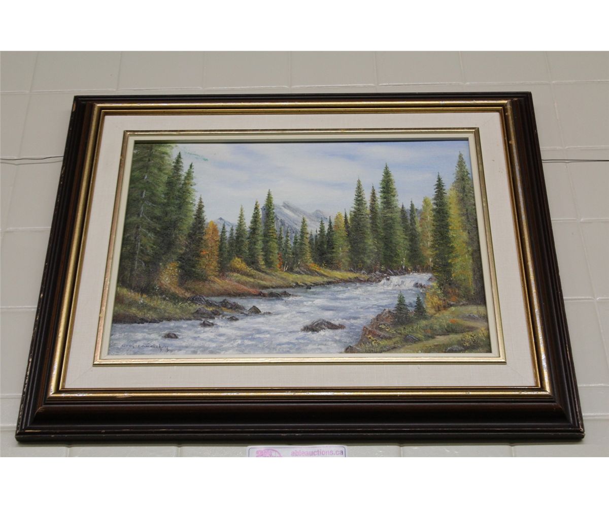 GEORGE ZINNIKER "MT. RUNDLE BOW RIVER ON JOHNSON CANYON" OIL ON BOARD, SIGNED LOWER LEFT 16" X 12"