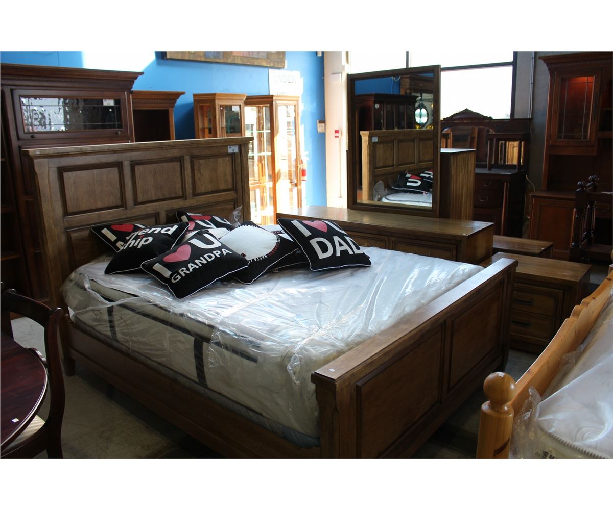 GERARD COLIN 6PC OAK BEDROOM SUITE; QUEEN SIZE BED HEADBOARD FOOTBOARD RAILS, 9 DRAWER DRESSER WITH MIRROR, HIGHBOY ARMOIRE AND 2 NIGHT STANDS