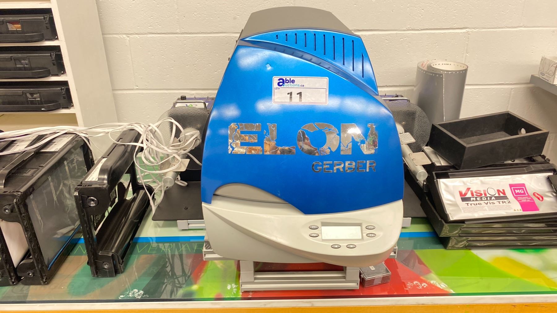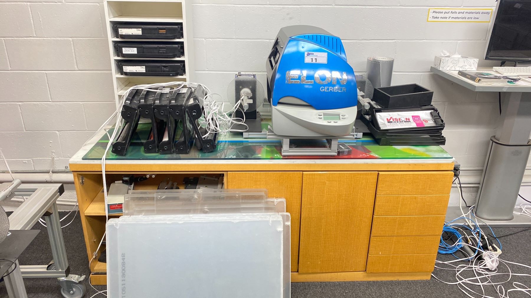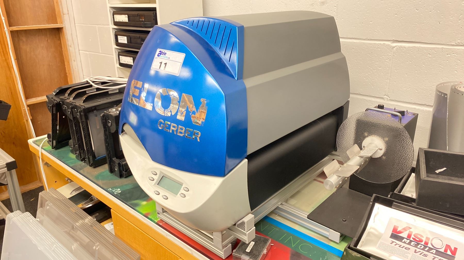 GERBER EDGE FX THERMAL TRANSFER PRINTER, (2) GRAPHIC MARKING SYSTEMS HEAVY DUTY REWINDER MACHINES & DESK WITH ASSORTED COPY MATERIAL CONTENTS (DESK: 75"L X 20"W X 30"H) *ITEM LOCATED OFF SITE IN VANCOUVER*