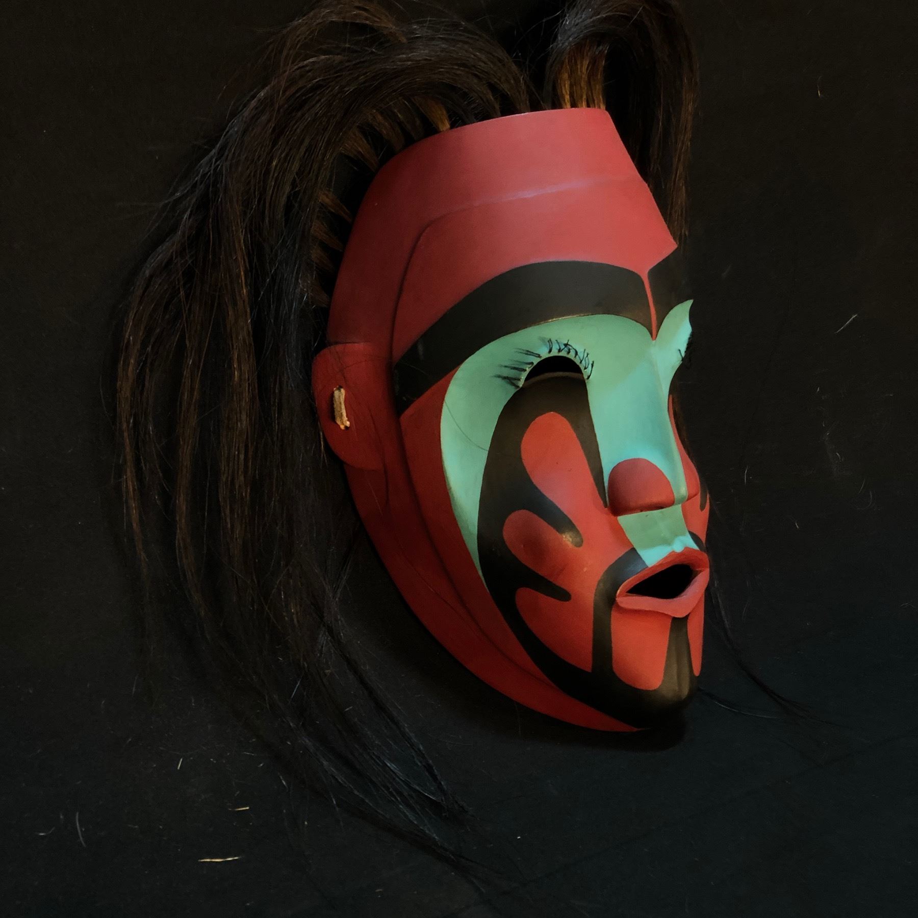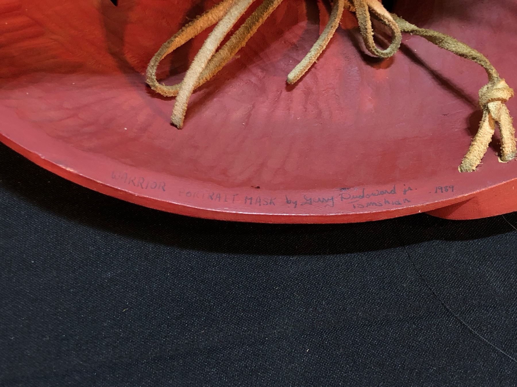 GERRY DUDOWARD OF TSIMSHIAN FIRST NATION, HAND CARVED AND PAINTED WARRIOR PORTRAIT MASK, WITH HORSE HAIR ACCENTS, SIGNED ON BACK BY ARTIST, CARVED IN 1989, APPROX. 12'' TALL