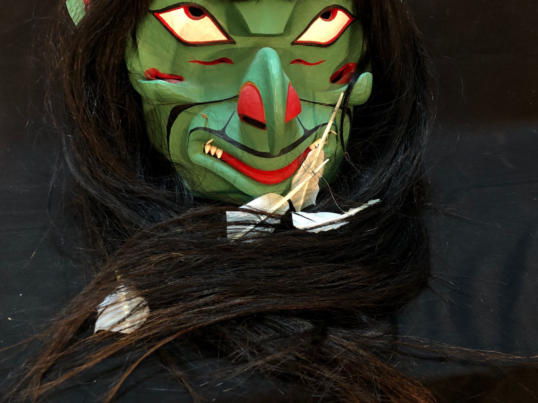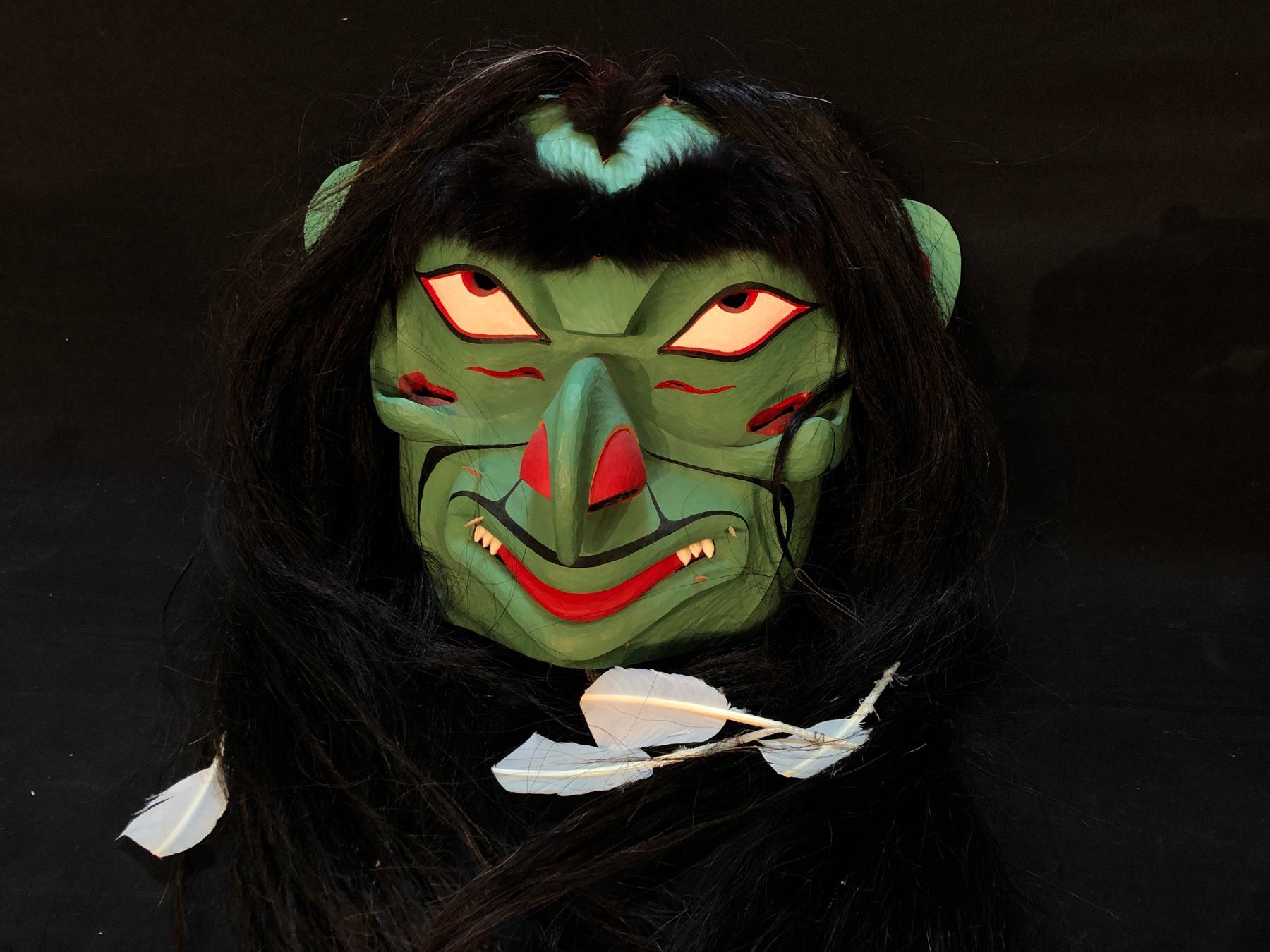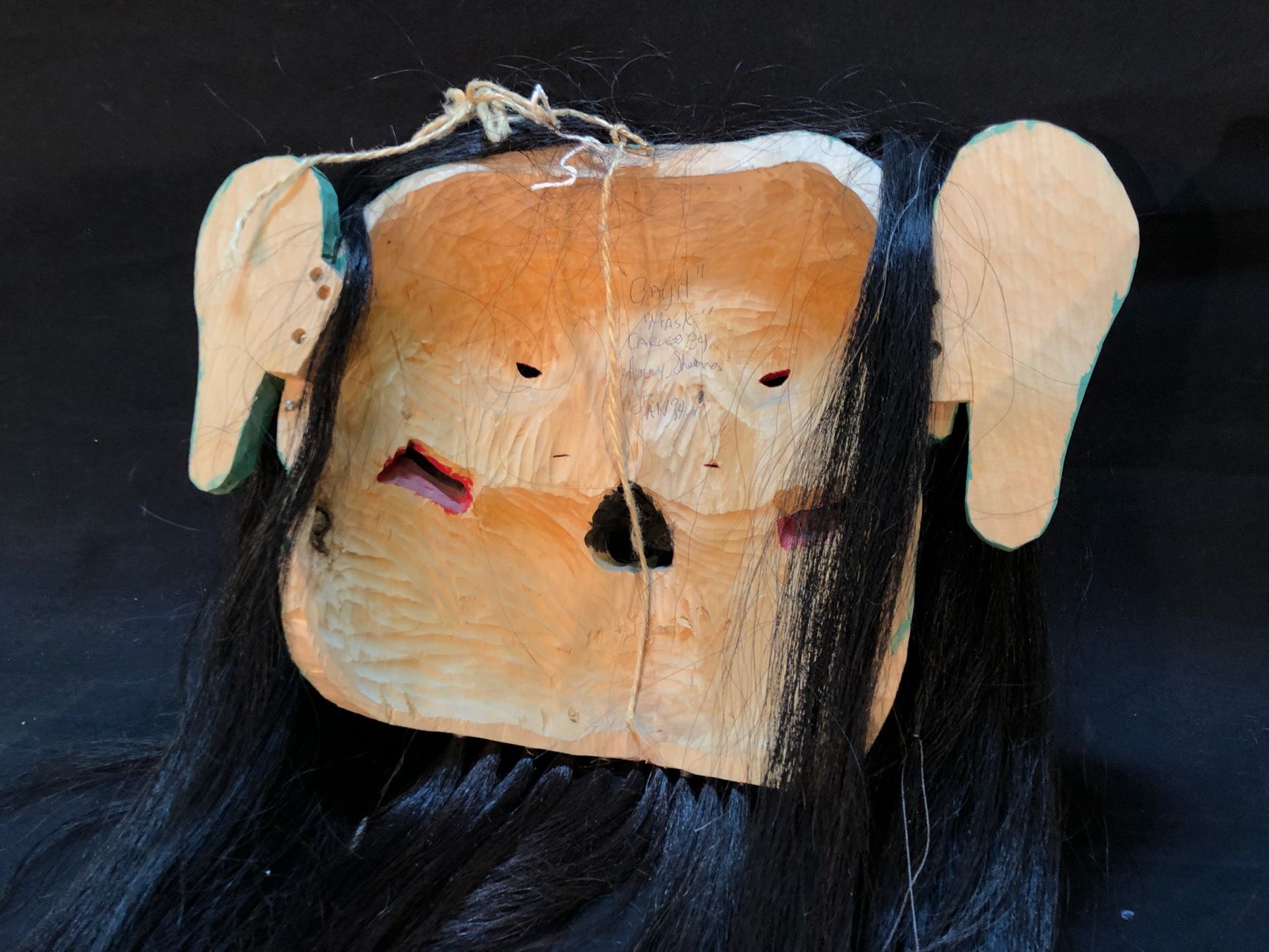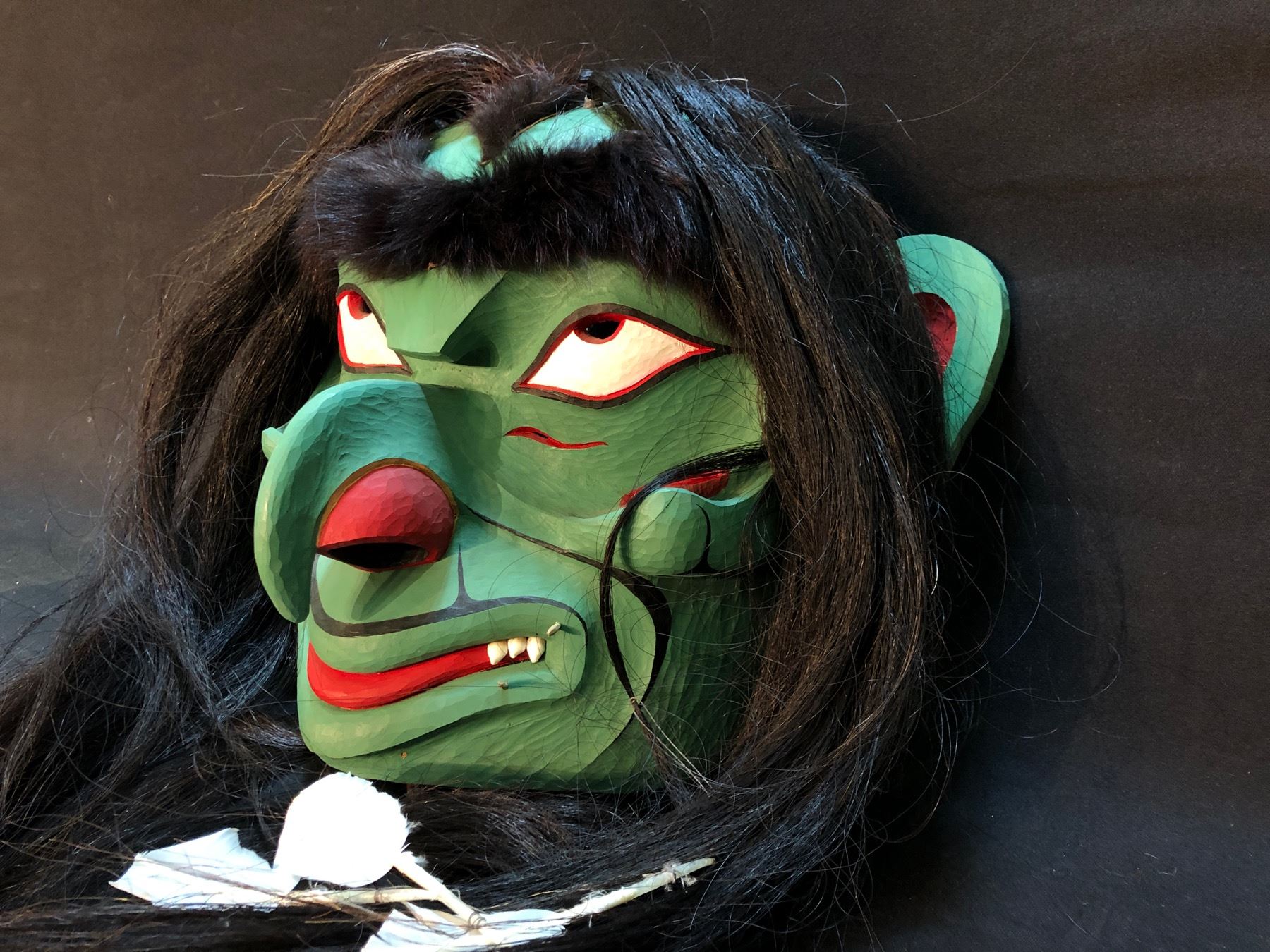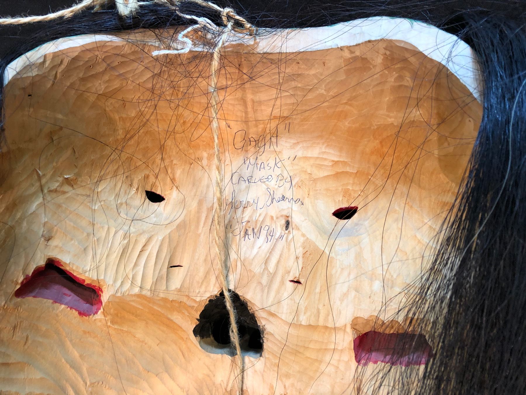 GERRY SHEENA "GAGIT MASK", WITH HORSE HAIR AND BEAR PELT ACCENTS, APPROX. 34'' TALL INC. HORSE HAIR, CARVED IN JAN. 1994, SIGNED ON BACK BY ARTIST