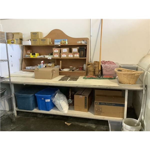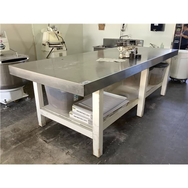 LARGE STAINLESS STEEL & WOOD PREP TABLE WITH CONTENTS UNDERNEATH 120"X48"38"H