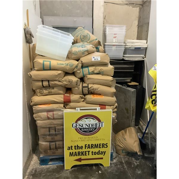 PALLET OF ASSORTED LIGHT RYE & WHITE FLOUR, BAKING SHEETS, BLACK METAL RACK, TOTES & ALL CONTENTS
