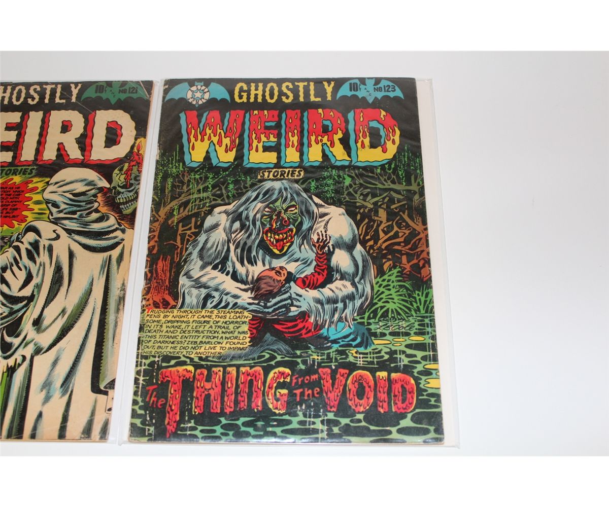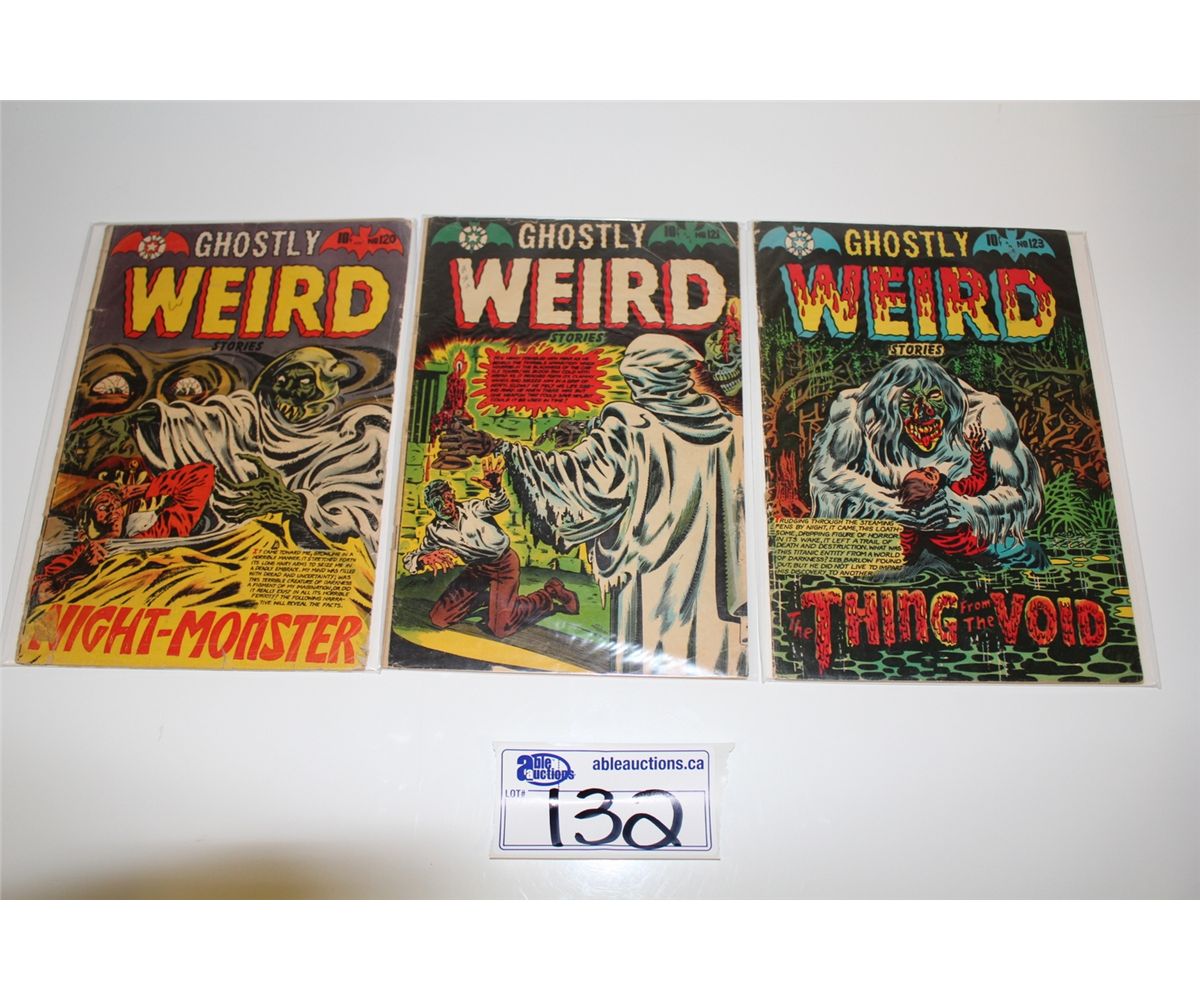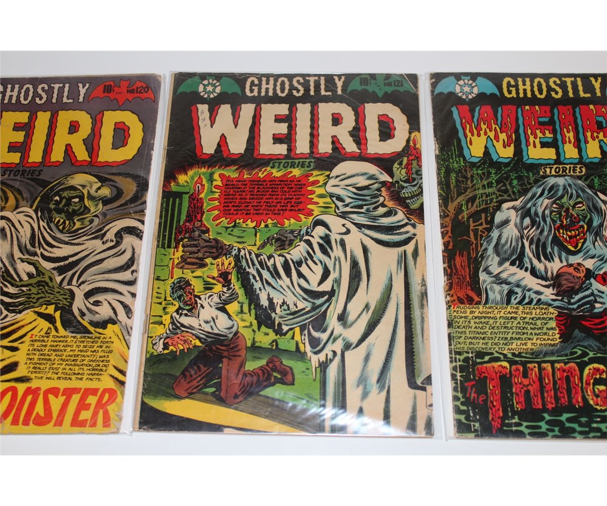 GHOSTLY WEIRD STORIES #120 (#1) 121 & 123 (1953-54) EXPLICIT PRECODE HORROR TITLE FEATURING CLASSIC L.B. COLE COVERS. LOWER TO SOLID MID GRADE AVERAGE- #121 IS MISSING 2 CENTRE PAGES, AFFECTS STORY