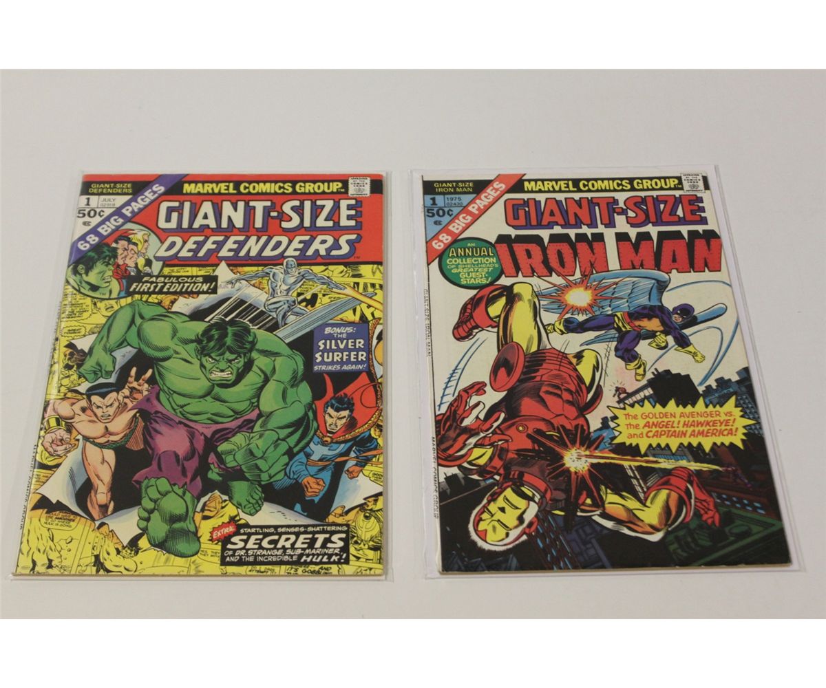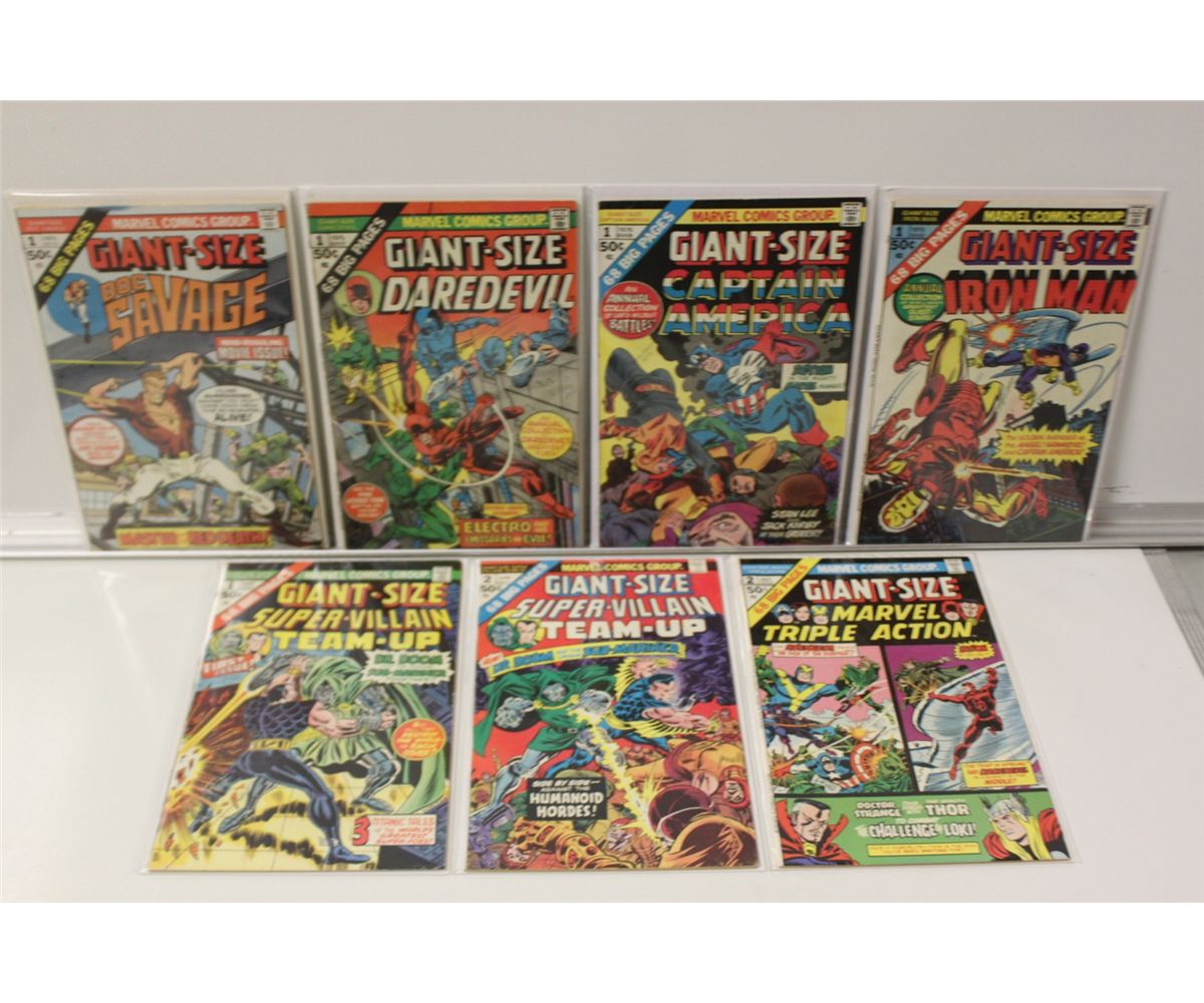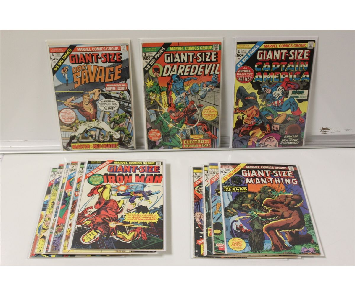 GIANT SIZE MARVEL SERIES LARGE LOT OF 13 ISSUES. MIXED TITLES - IRON MAN, CAPTAIN AMERICA, DAREDEVIL, ETC.  MIXD GRADES, MANY SHARP COPIES.  1974-75, SWEET LOT!