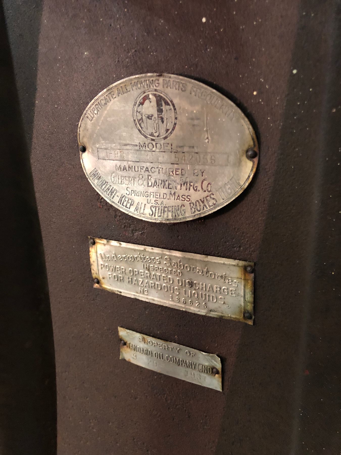 GILBERT & BARKER MFG. CO. VINTAGE GAS PUMP, CIRCA 1930, MODEL T-90 SX-31, SERIAL NUMBER 542056, ALL