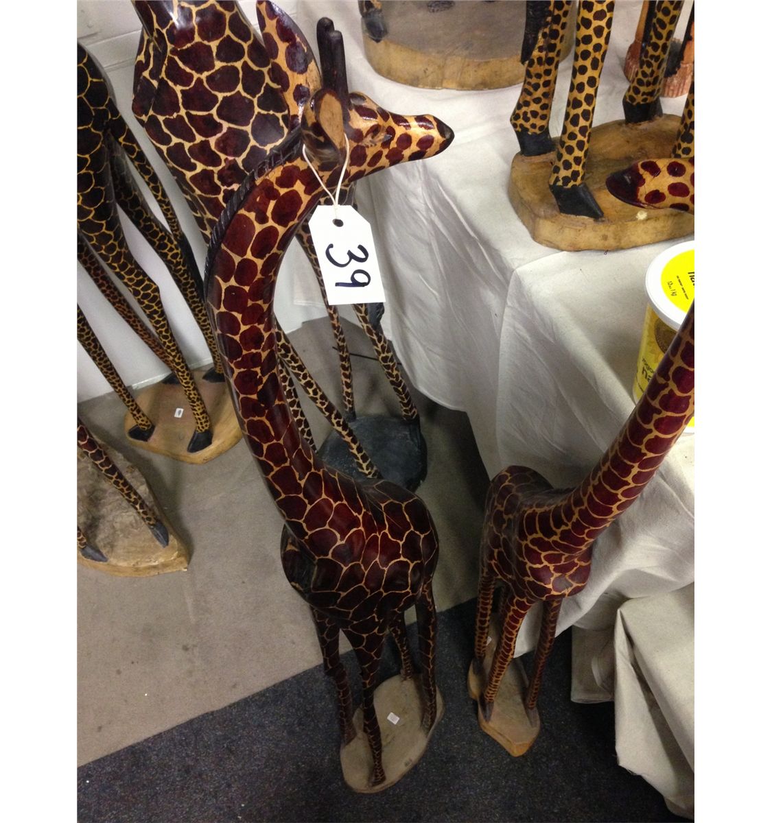 GIRAFFE, HAND CARVED FROM ONE PIECE OF AFRICAN MAHOGANY. 49" TALL