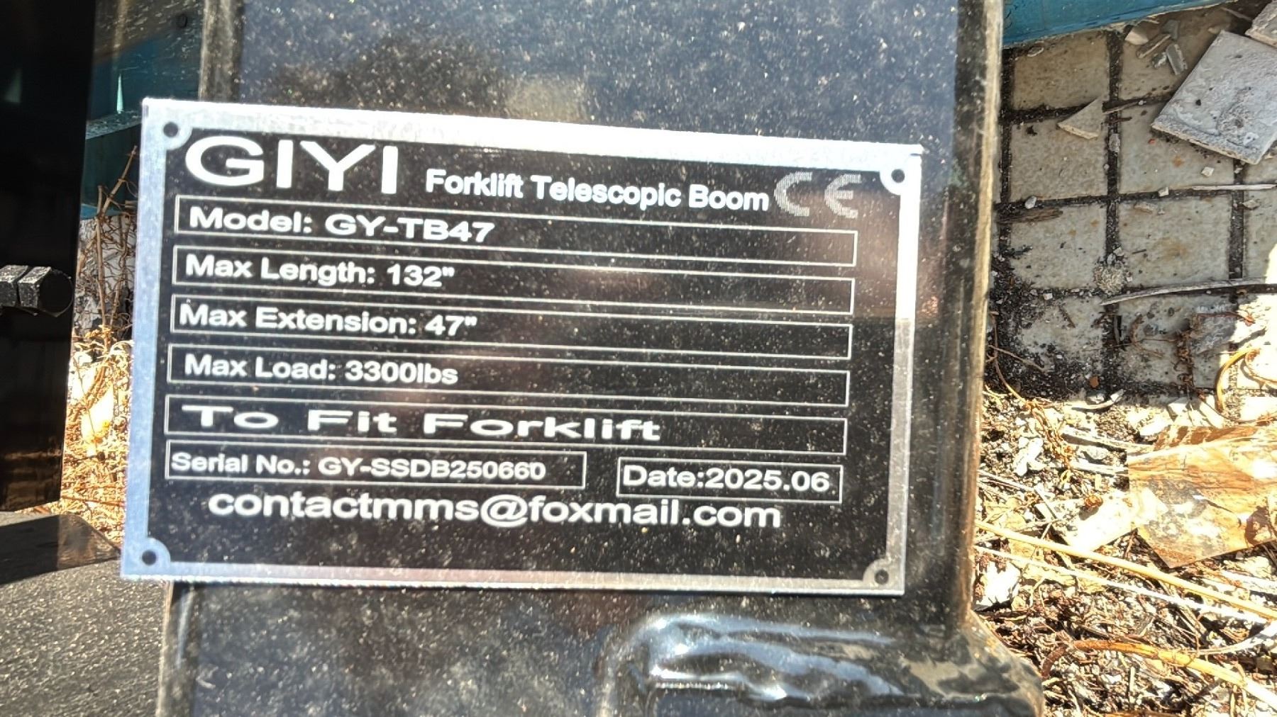 GIYI FORKLIFT TELESCOPIC BOOM ATTACHMENT TO FIT FORKLIFT GY-TB47, 132" MAX LENGTH, 47" MAX EXTENSION, 3300LBS MAX LOAD SERIAL# GY-SSDB250660