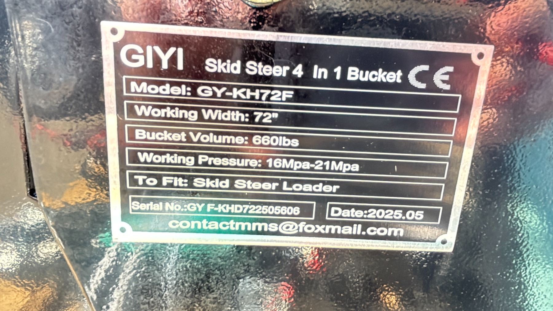GIYI SKID STEER 4-IN-1 BUCKET TO FIT SKID STEER LOADER GY-KJ72F, 72" WORKING WIDTH, 600LBS BUCKET VOLUME, 10MPA-21MPA WORKING PRESSURE SERIAL# GYF-KHD722505606