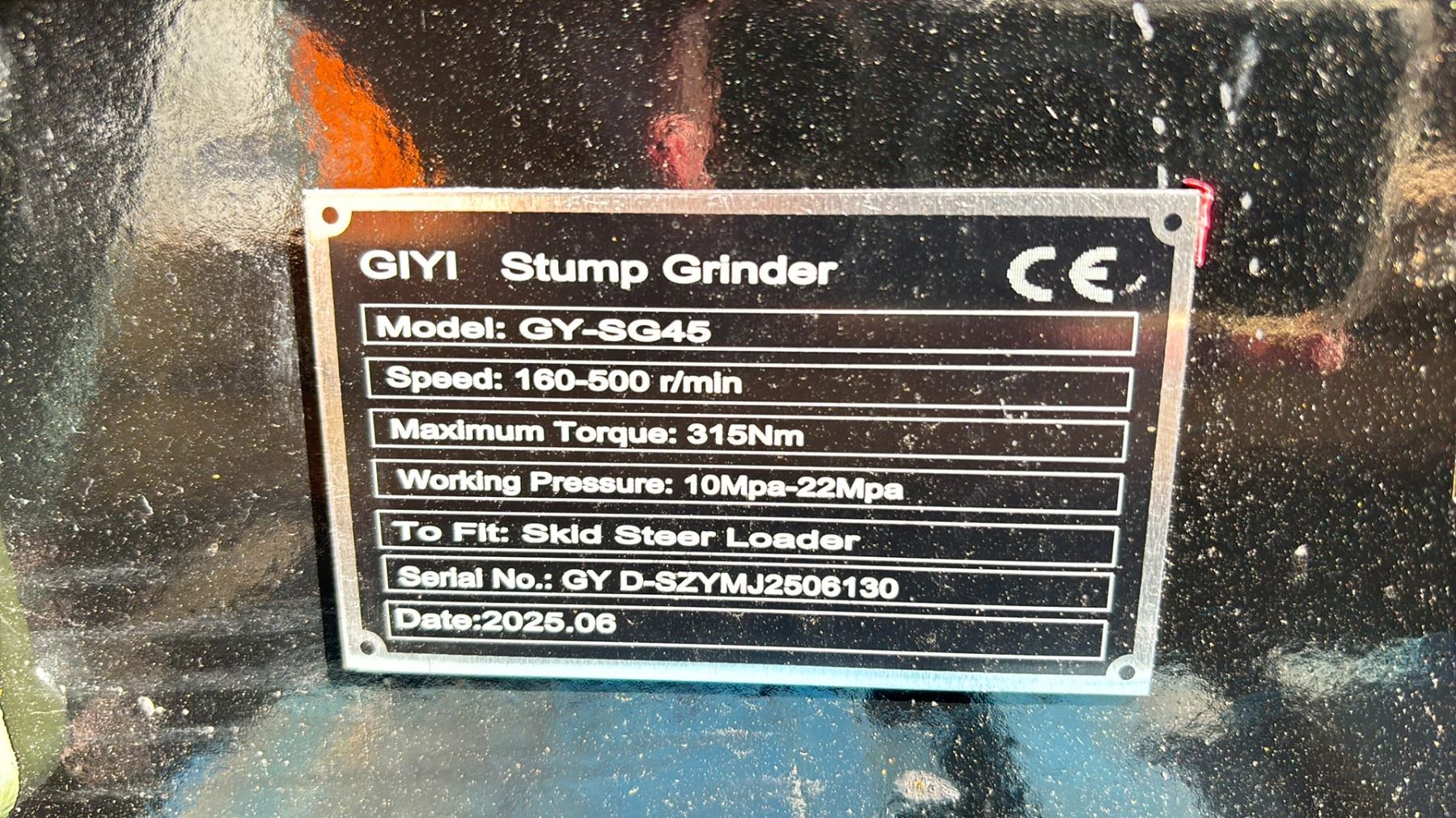 GIYI STUMP GRINDER TO FIT SKID STEER LOADER GY-SG45, 160-500 RPM, 315NM MAX TORQUE, 19MPA-22MPA WORKING PRESSURE, SERIAL# GYD-S2YMJ2506130