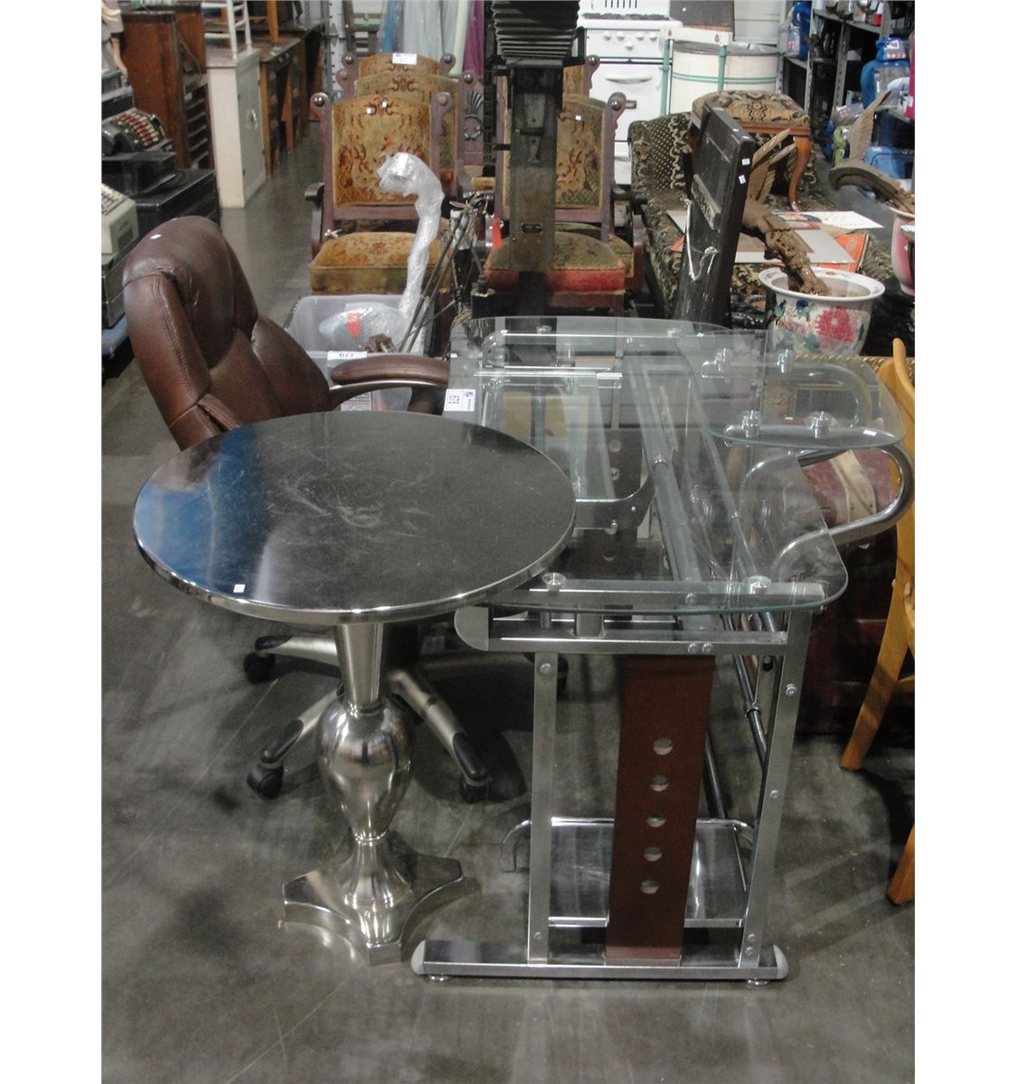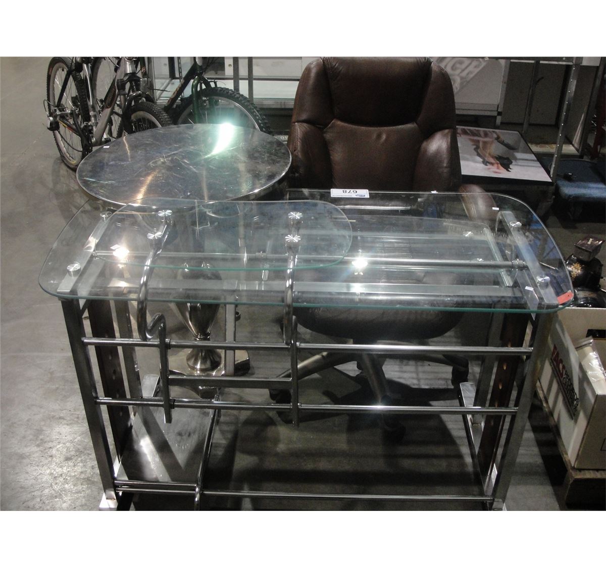 GLASS AND CHROME OFFICE DESK, CHROME SIDE TABLE AND BROWN LEATHER OFFICE CHAIR