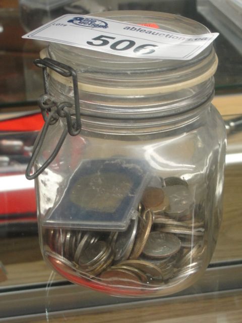 GLASS JAR FILLED WITH ASSORTED WORLD COINS