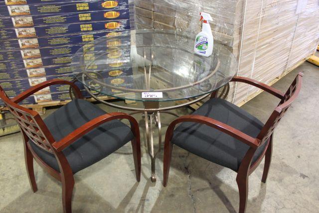 GLASS & METAL TABLE WITH 2 CHERRY SIDE CHAIRS
