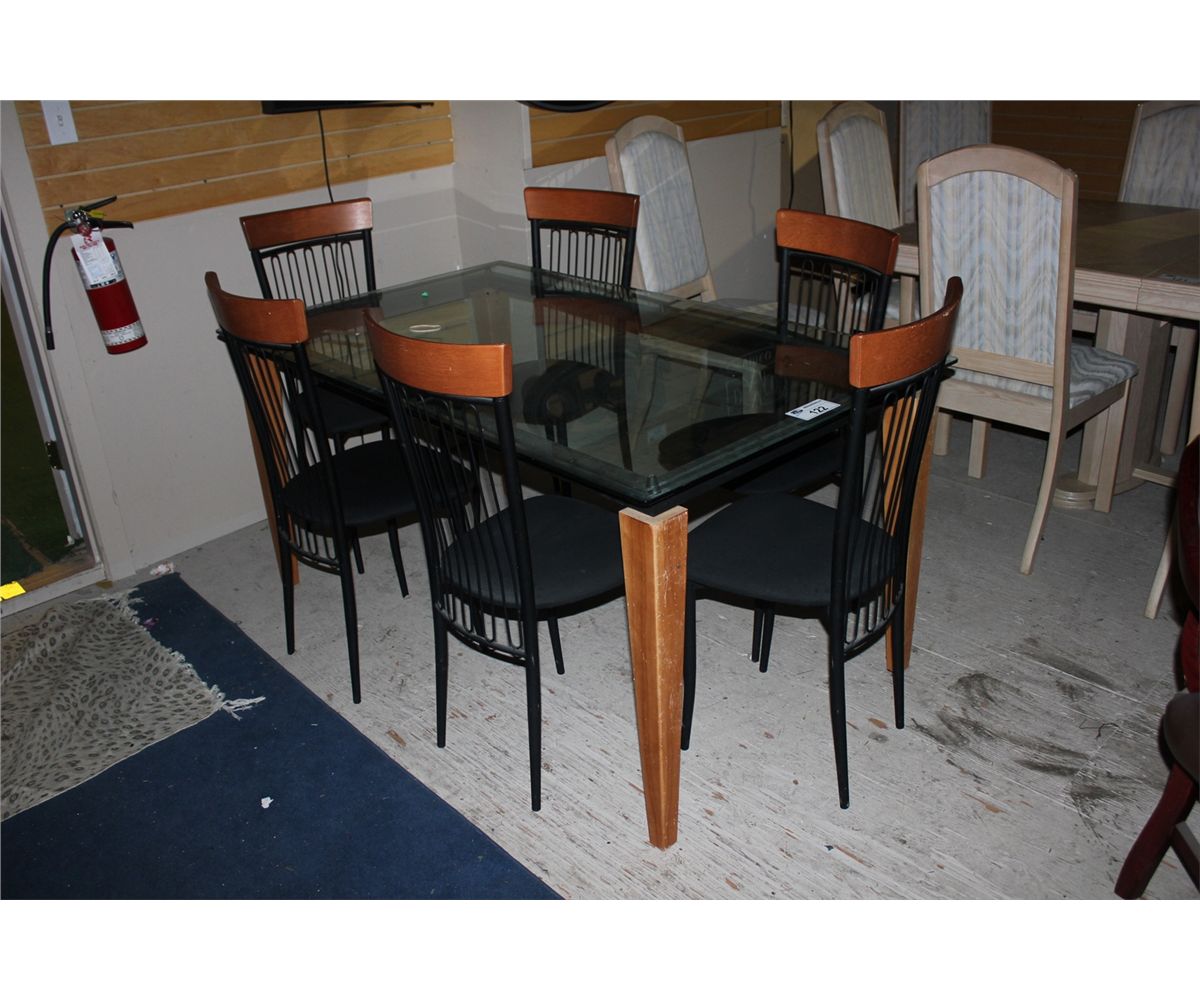 GLASS TOP BLACK METAL / WOOD DINING TABLE WITH BLACK METAL CHAIRS