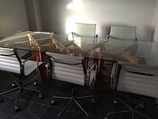 GLASS TOP CUSTOM BUILT BOARDROOM TABLE WITH 5 CHAIRS