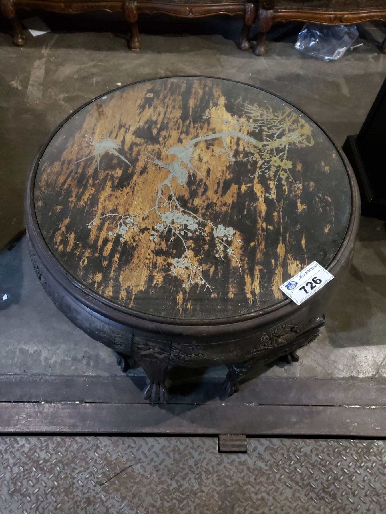 GLASSTOP COFFEE TABLE WITH CARVED LEGS, INLAYED DESIGN AND 4 STOOLS