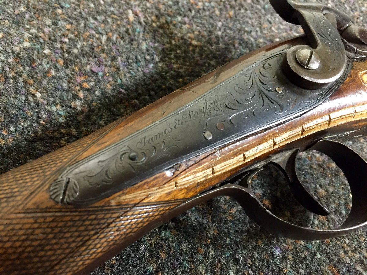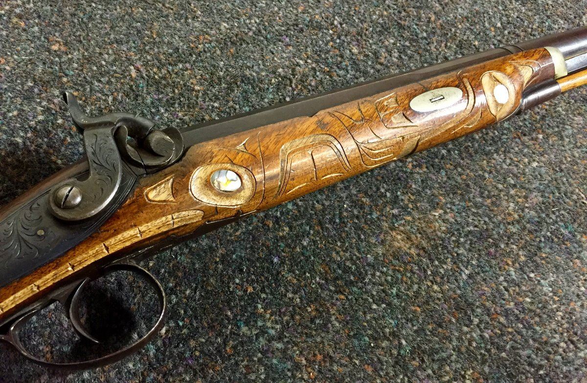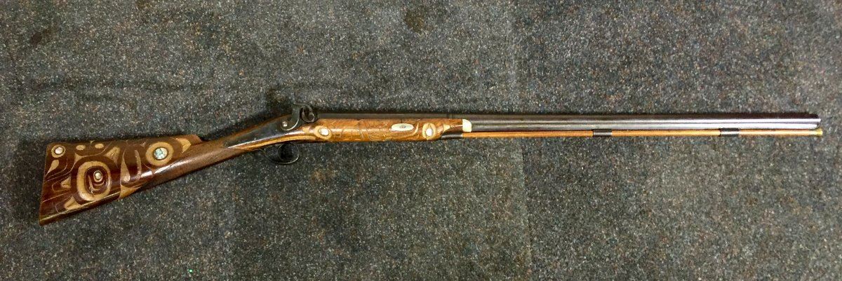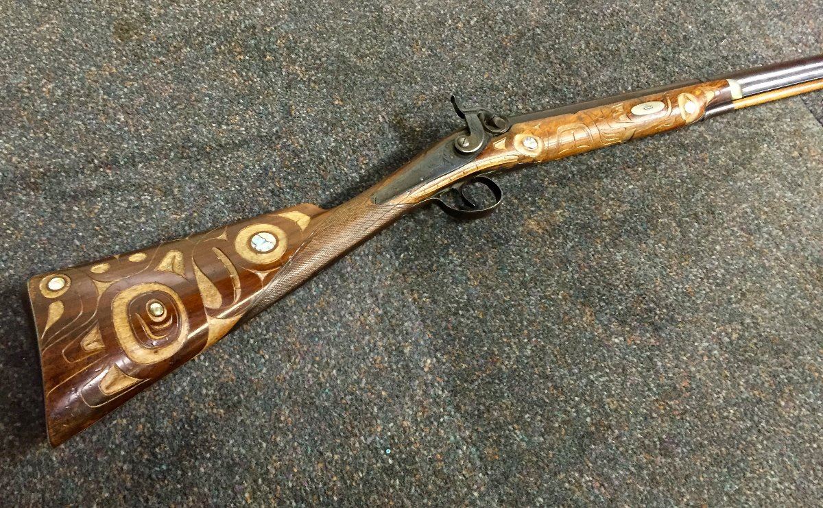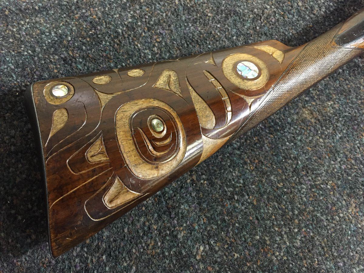 GLEN RABENA, HAND CARVED ENGLISH PERCUSSION FOWLER- SINGLE BARREL PERCUSSION FOWLING PIECE, LOCK MARKED "JAMES & PAYTON" CHECKERED, STRAIGHT GRIP. STOCK CARVED WITH FIRST NATIONS MOTIFS INCLUDING OWLS AND HAS ABALONE INLAYS. TRIGGER TANG MARKED "RABENA" AND IS THE CONFIRMED WORK OF