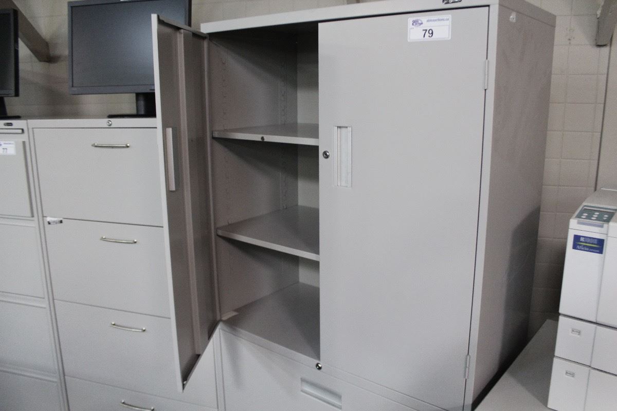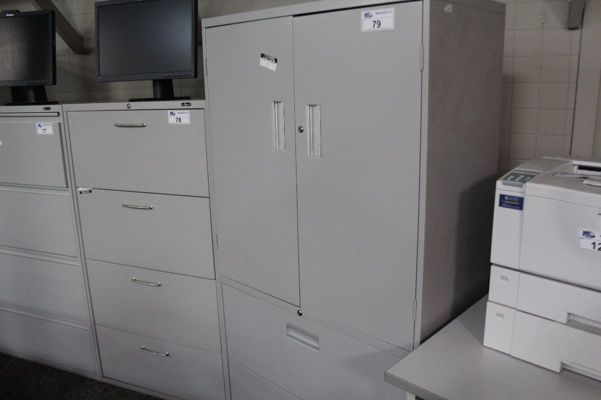 GLOBAL GREY 2 DRAWER LATERAL FILE CABINET WITH DOUBLE DOOR OVER HEAD STORAGE