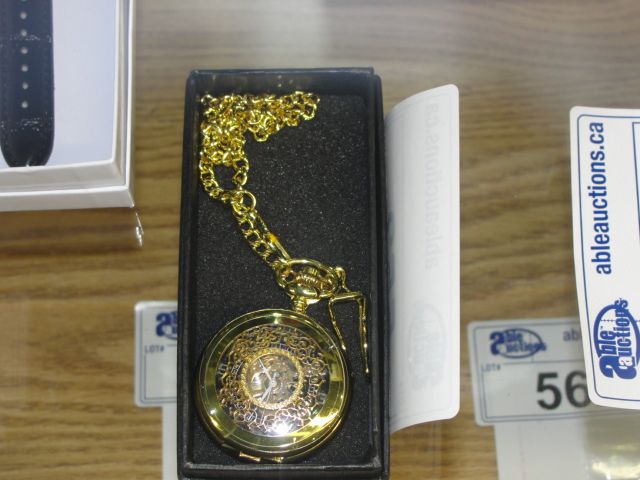 GOLD FINISH MECHANICAL SKELETON POCKET WATCH WITH CHAIN