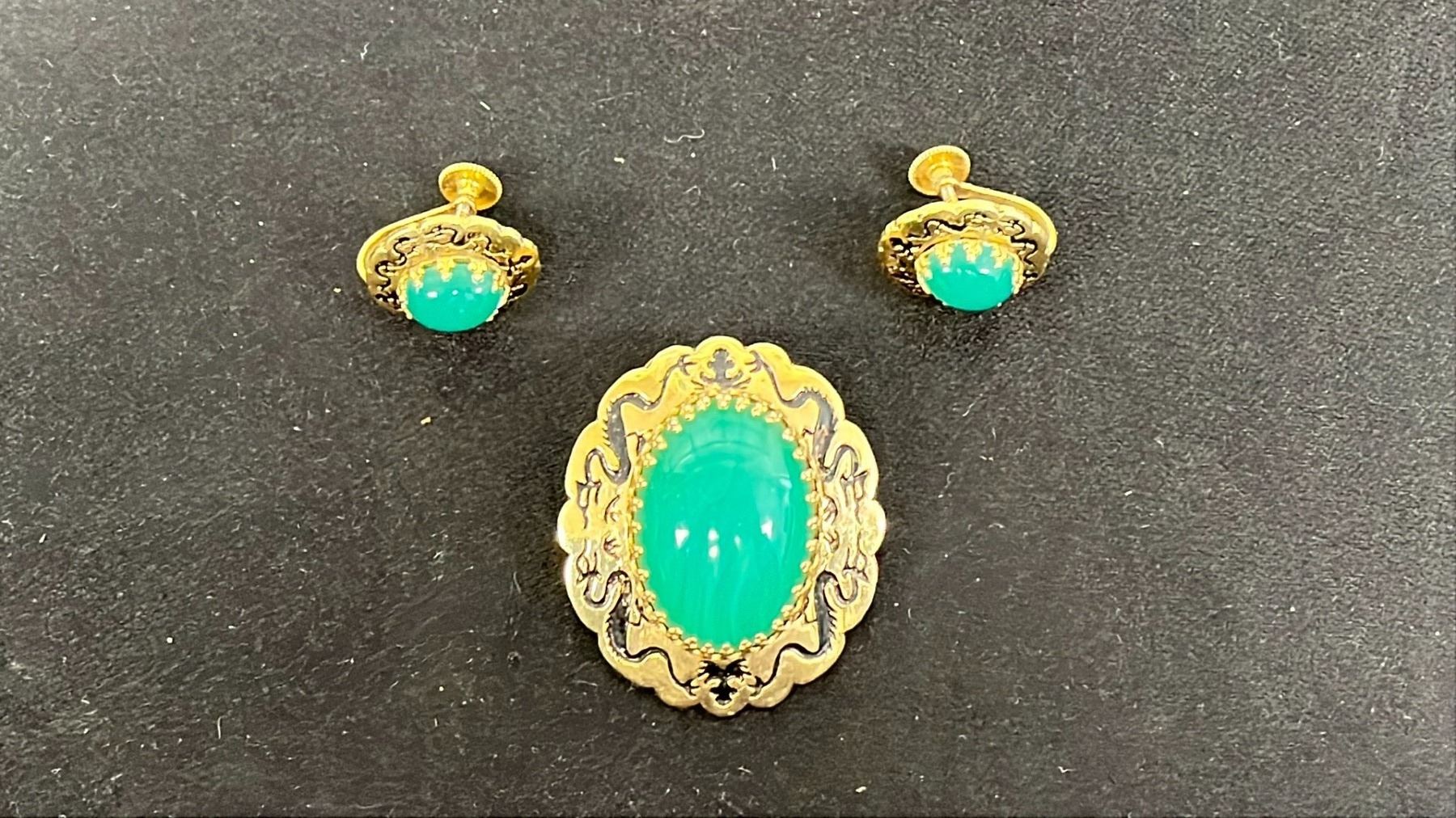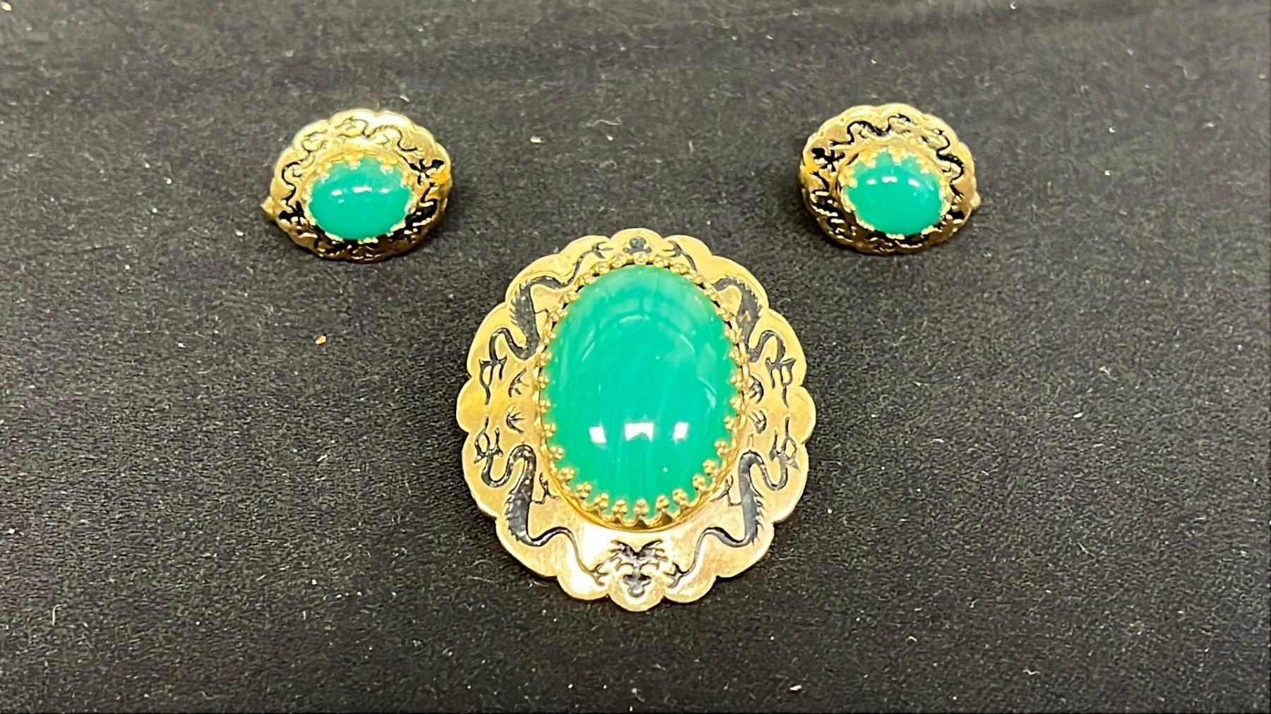GOLD JADE SIAM DRAGON BROOCH ANTIQUE SCREWBACK EARRINGS SET