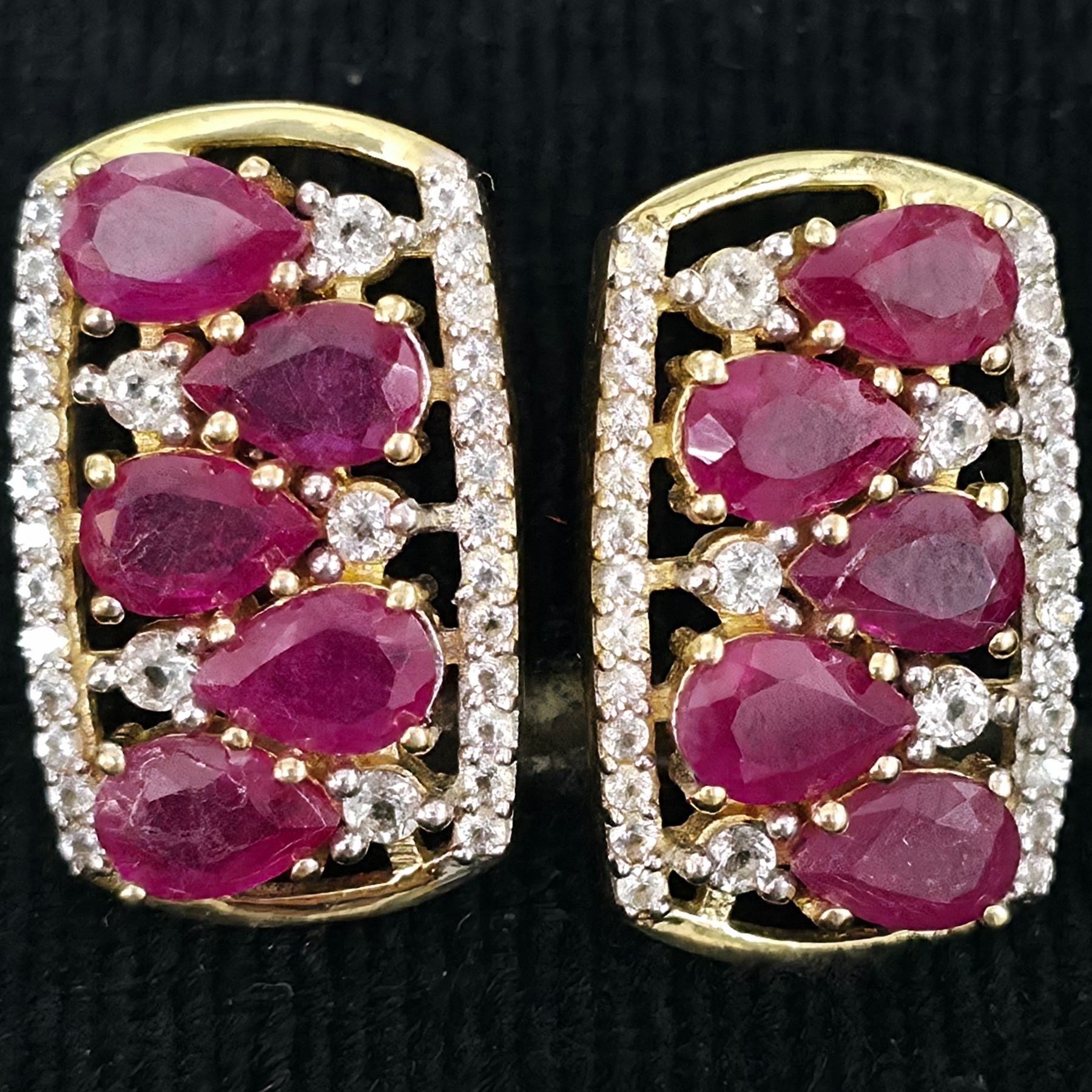 GOLD PLATED SILVER RUBY WHITE TOPAZ(2.9CT) GOLD RHODIUM PLATED EARRINGS (~WEIGHT 7.85G)