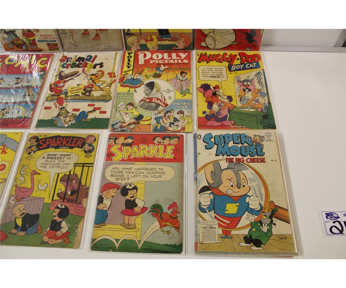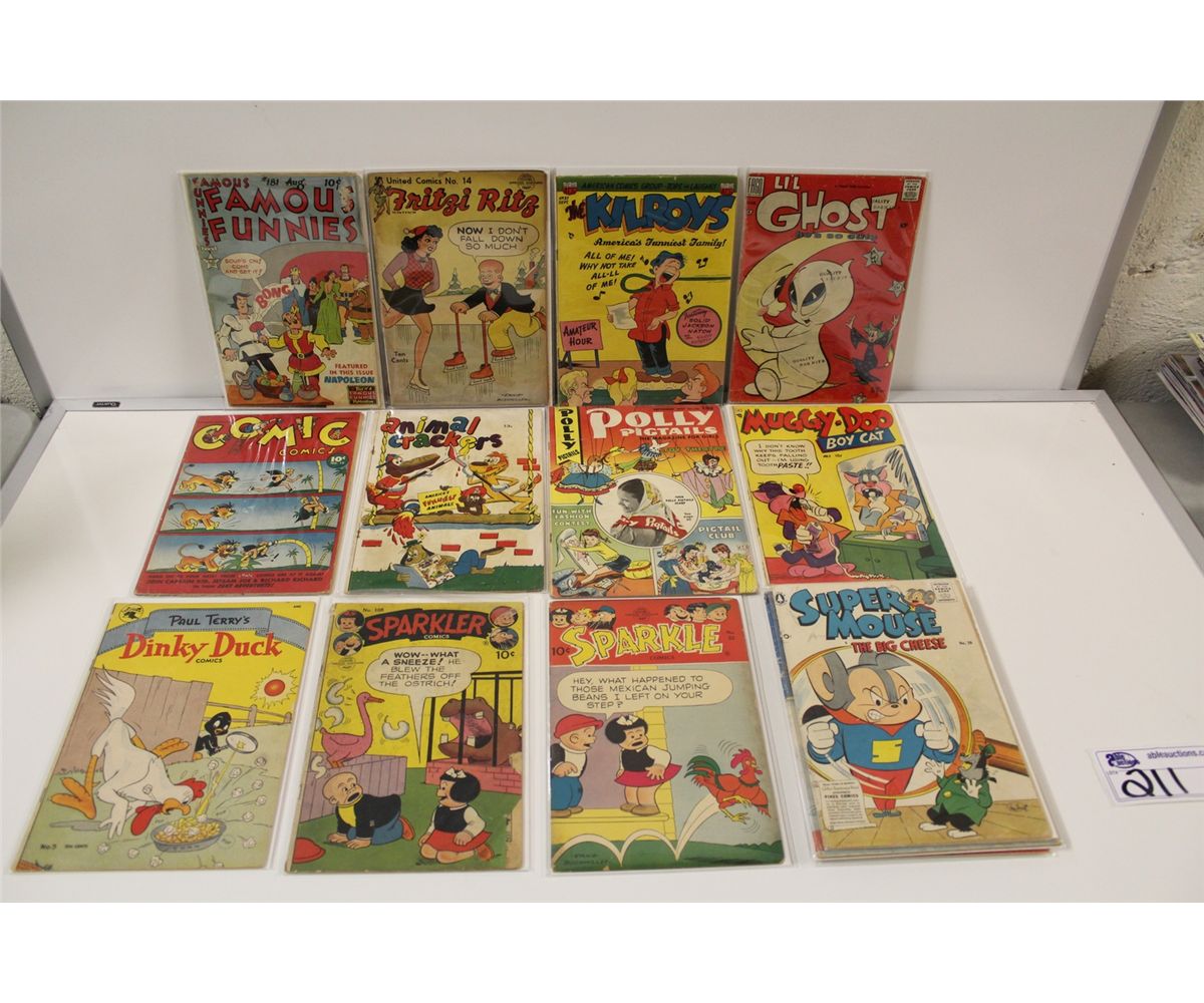 GOLDEN AGE FUNNIES (1940'S-1950'S) 10 CENT COVERS, INCLUDES: FAMOUS FUNNIES #181, MUGGY DOO #1, SUPER MOUSE, DINKY DUCK AND MORE. LOW GRADE AVERAGE
