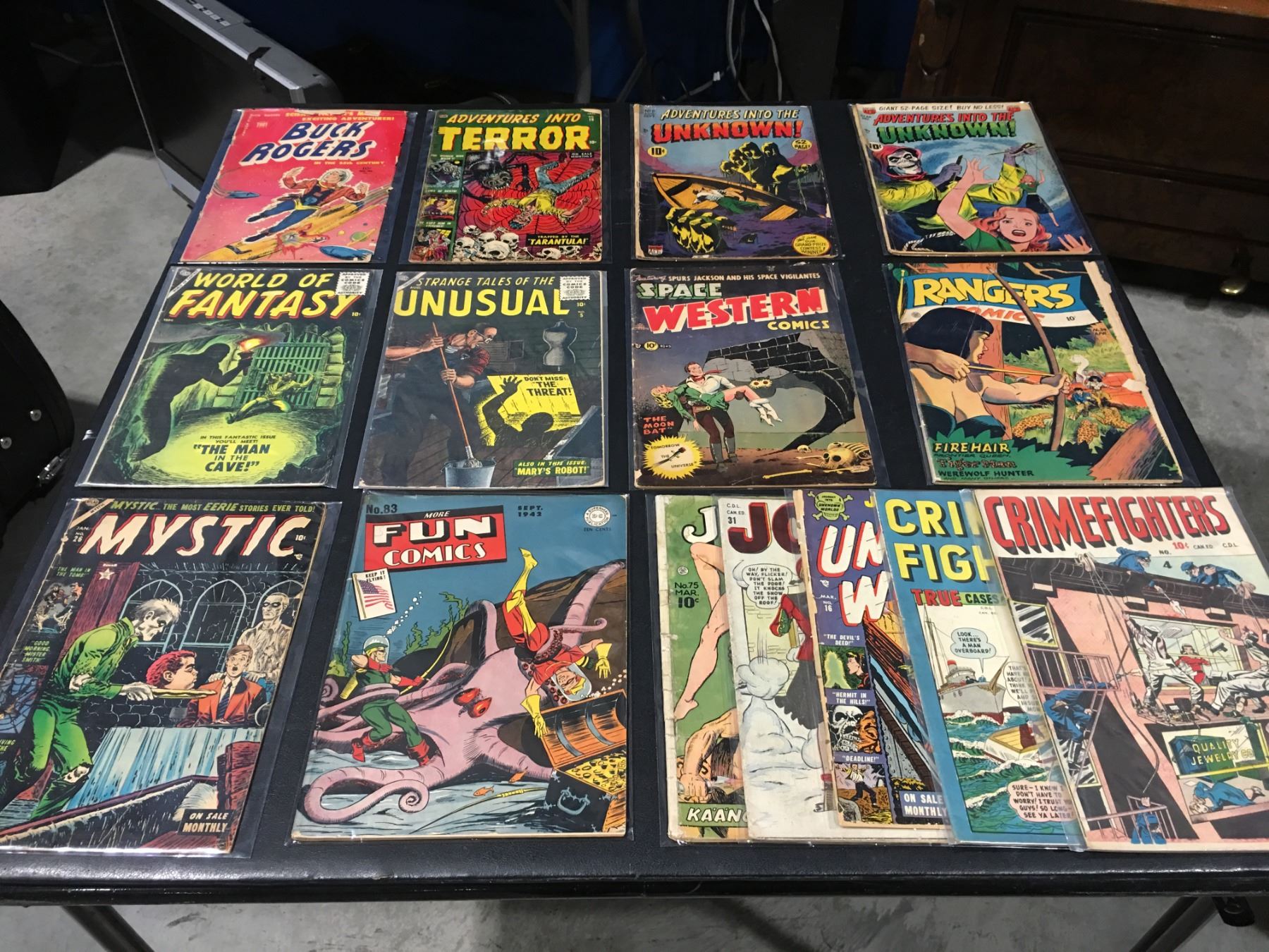 GOLDEN AGE LOT OF 15 ISSUES (1940'S/50'S) LOT INCLUDES HORROR, CRIME & SCI-FI COMICS MIX, MORE FUN COMICS #83 IS MISSING CENTREFOLD. VERY LOW TO LOW GRADE AVERAGE.