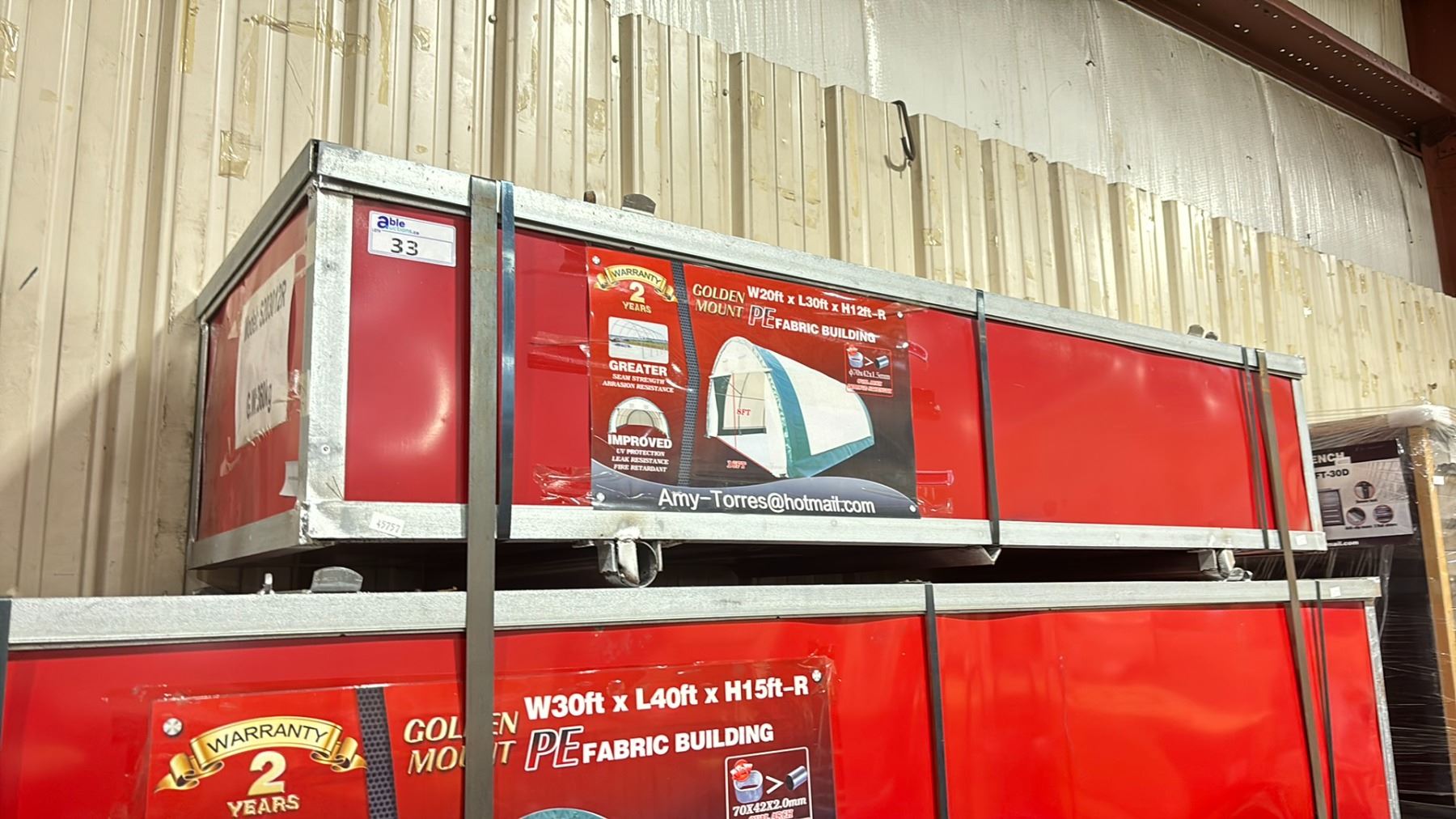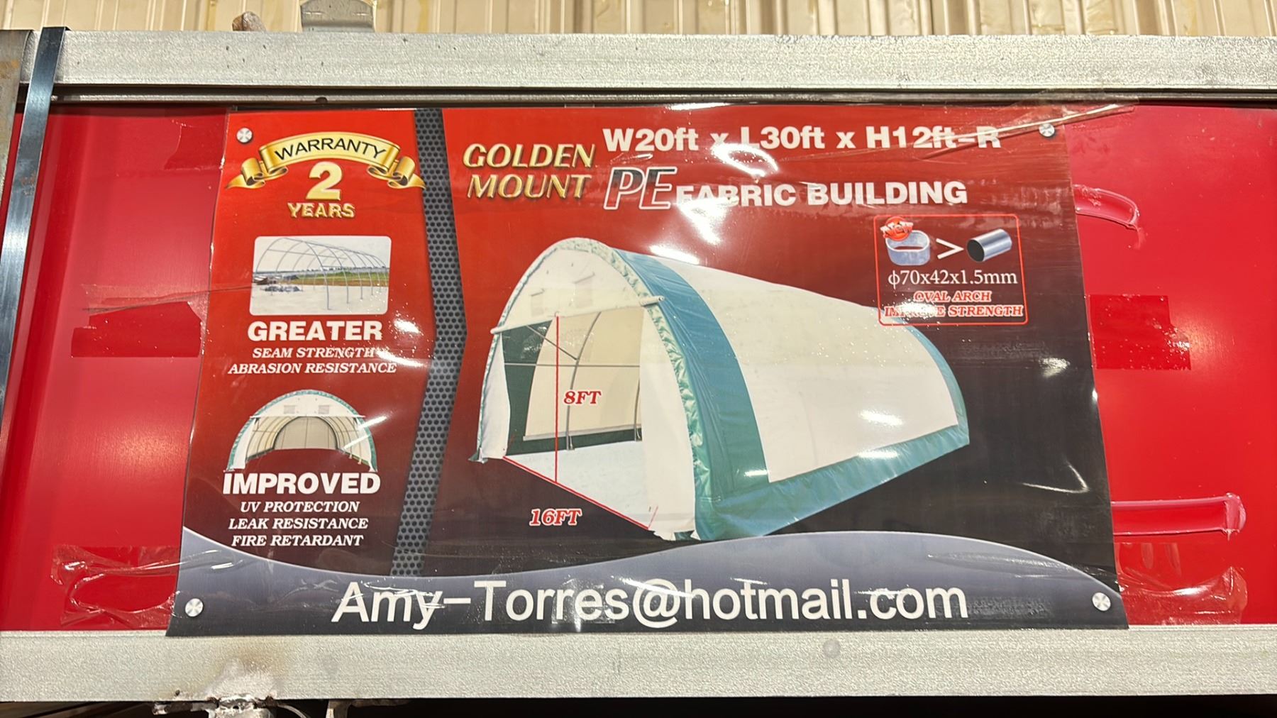 GOLDEN MOUNT 20'X30'X12' HIGH ROUND ROOF PE FABRIC STORAGE BUILDING WITH 8' X 16' VEHICLE OPENING *IN CRATE* *GROSS WEIGHT 360KG*