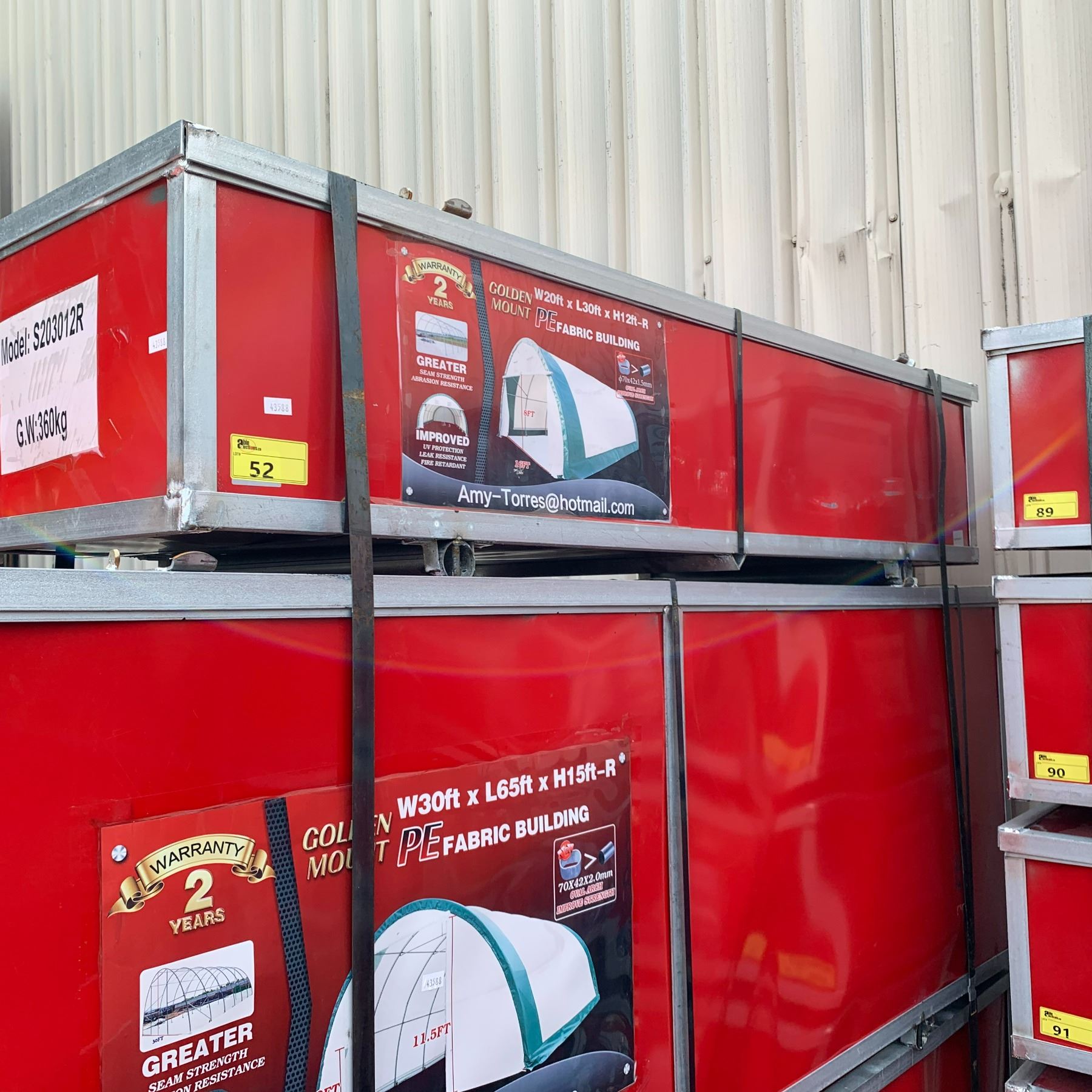 GOLDEN MOUNT 30'X65'X15' HIGH ROUND ROOF PE FABRIC STORAGE BUILDING WITH 11.5' X 11.5' ROLL DOOR & MAN DOOR 1120 KGS * IN CRATE *