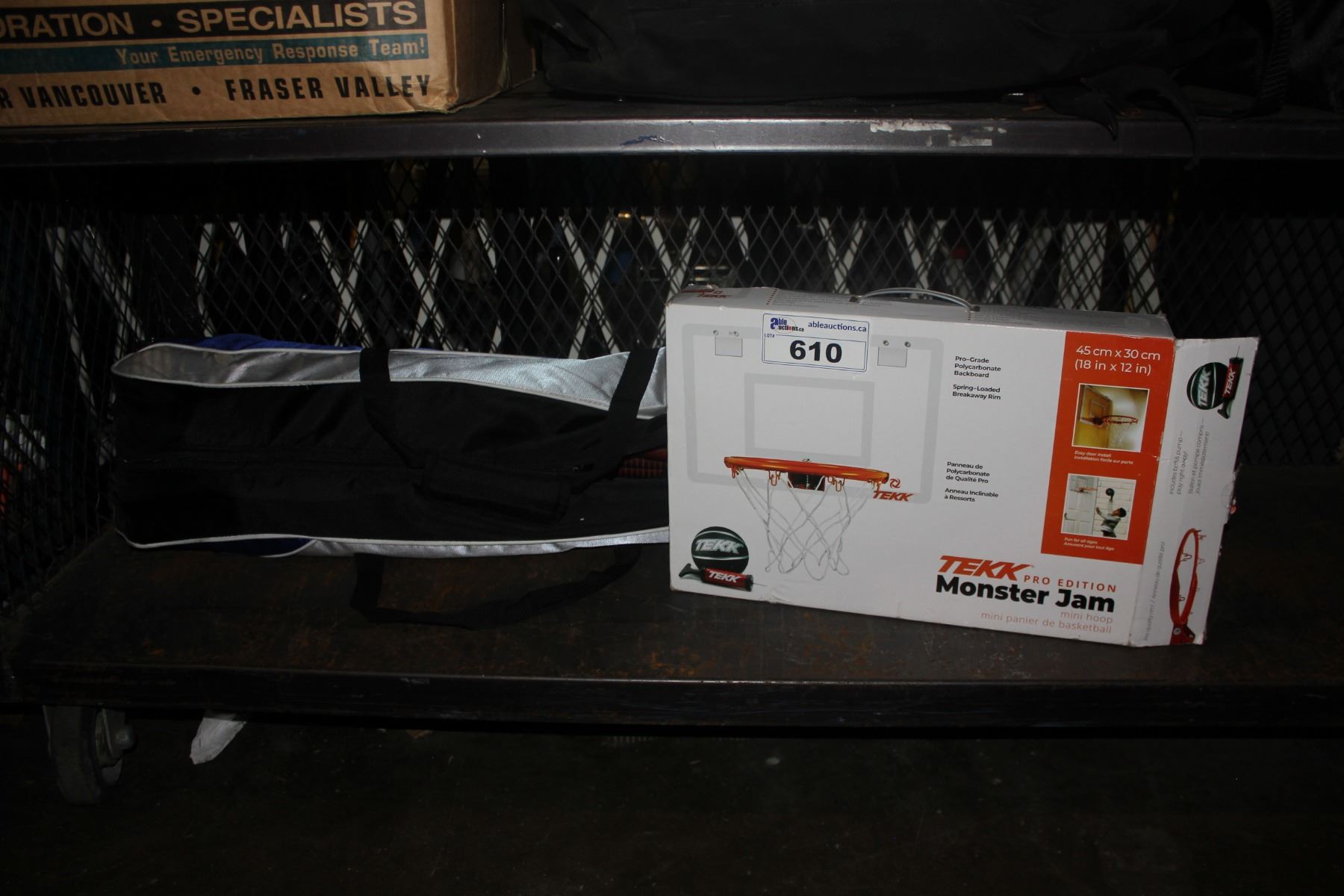 GOLF BAG WITH CONTENTS AND BASKETBALL HOOP
