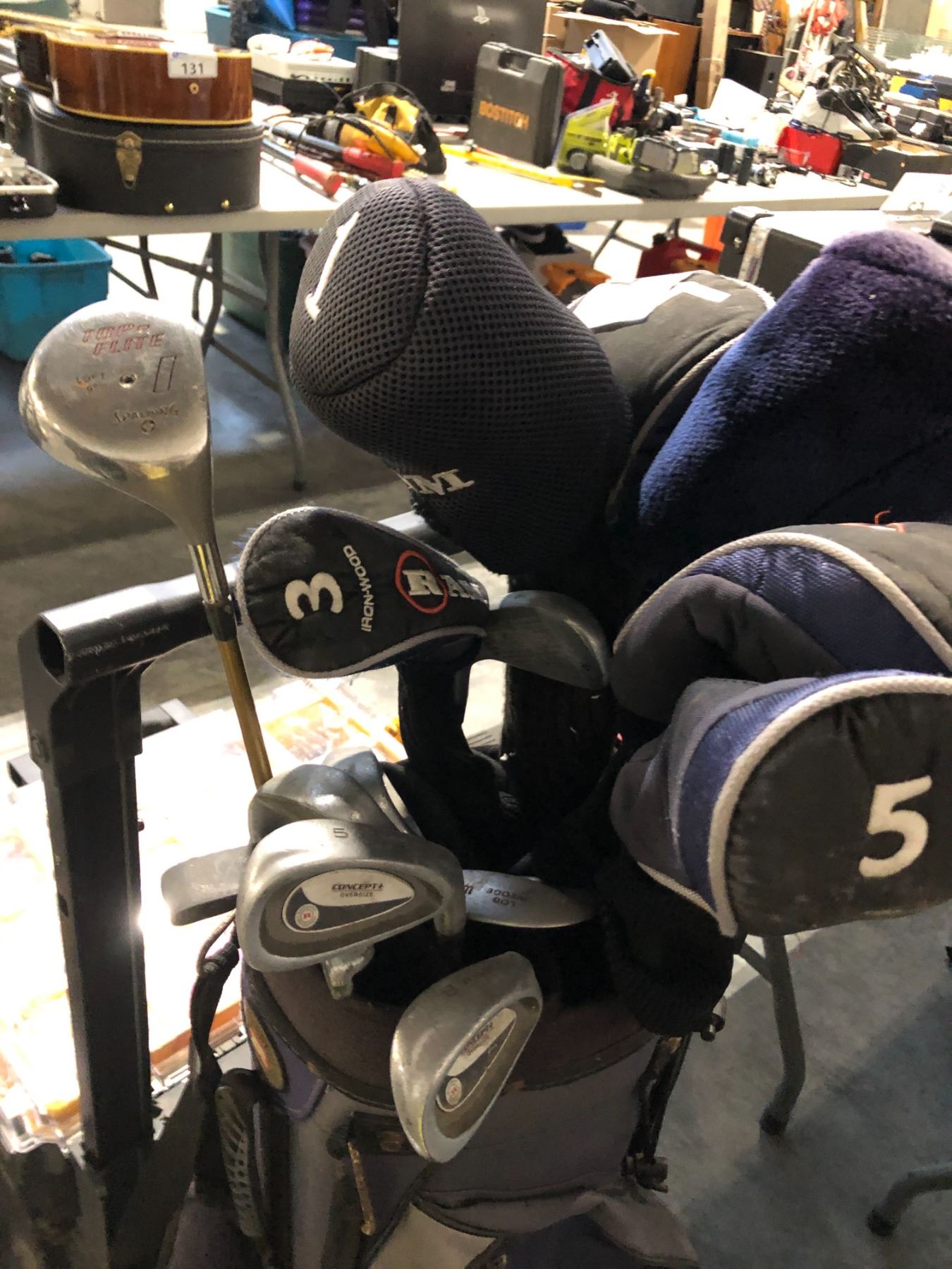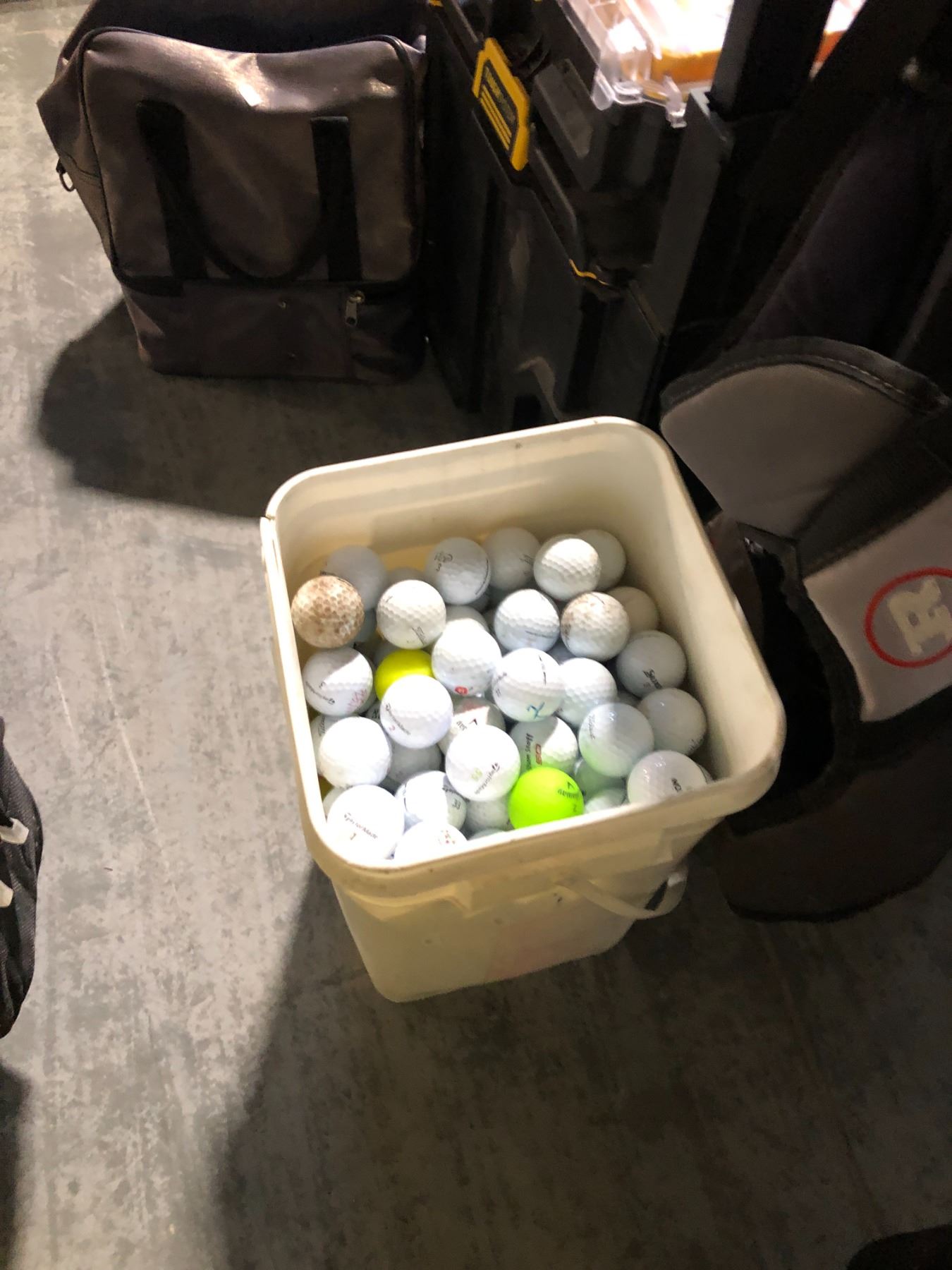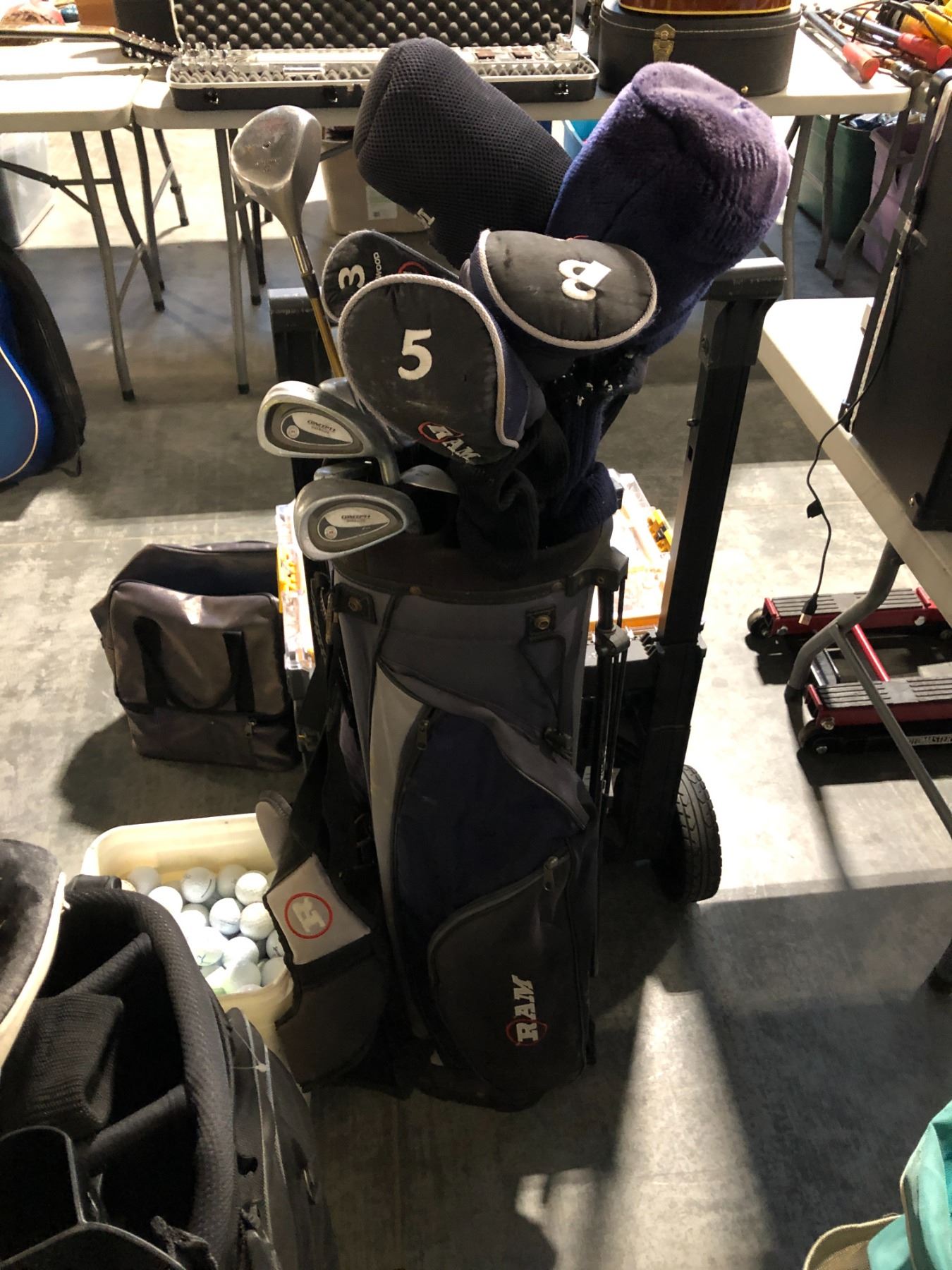 GOLF CARRY BAG INCLUDING CLUBS AND BUCKET OF GOLF BALLS INLCUDING RAM DRIVER AND PUTTER