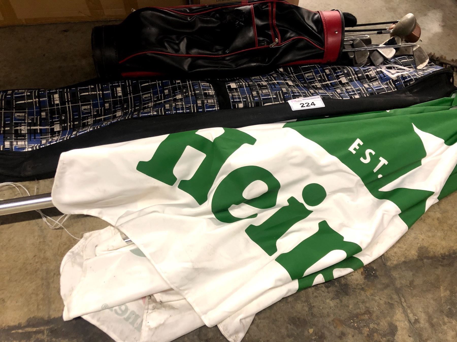 GOLF CLUBS WITH BAG, SNOWBOARD BAG AND HEINEKEN PATIO UMBRELLA