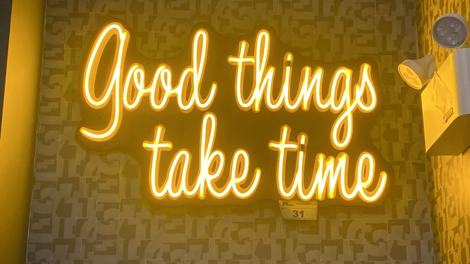 "GOOD THINGS TAKE TIME" LIGHTED SIGN - APPROX. 3FT ACROSS X 1 3/4FT WIDE *BUYER WILL REQUIRE TOOLS/HELP TO DISMANTLE*