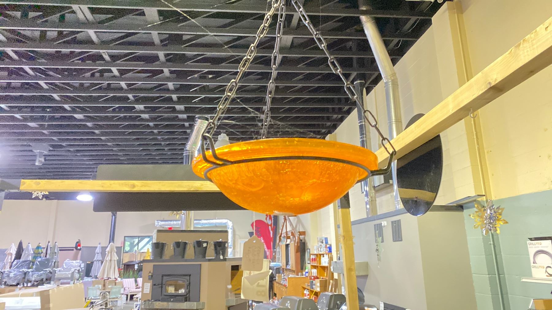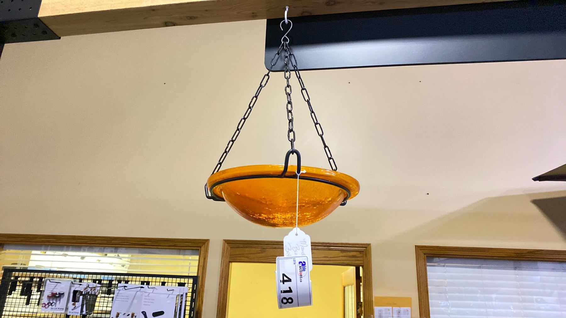 GORGEOUS AMBER CRACKLE GLASS HANGING BIRDBATH